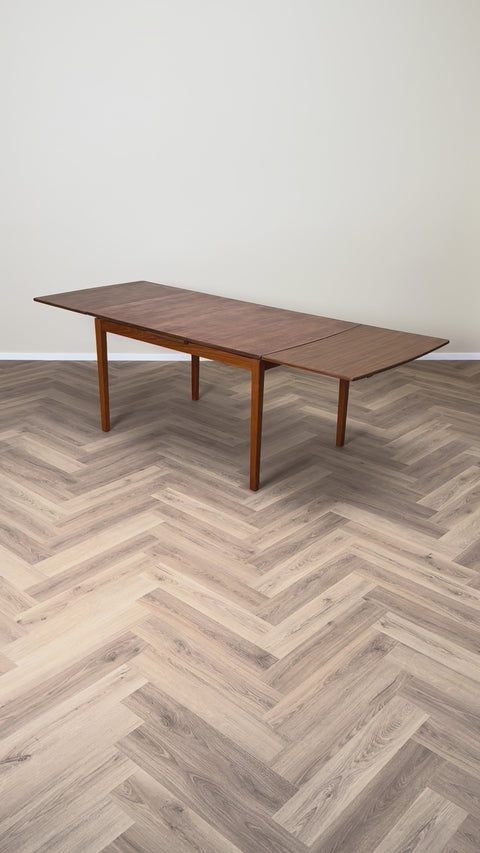 Matbord tillverkat i Sverige på 1950-60-talet av AB Möbelfabriken Örnen. Det är gjort av teakträ i stommen och teakfaner på bordsskivan. Matbordet har noggrant restaurerats av vårt team och har behandlats med ett lager av linolja och hårdvaxolja. Bordet är ett begagnat föremål i restaurerat skick med små användningsspår såsom små repor.