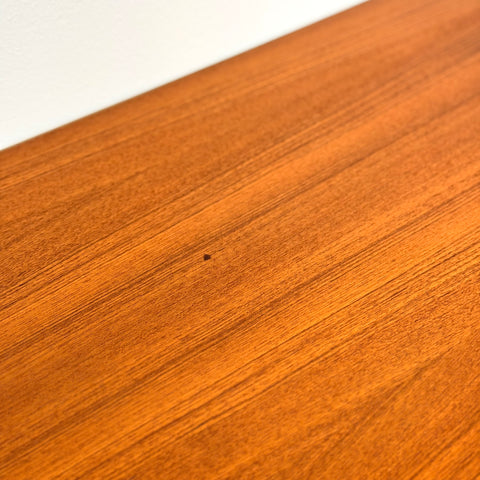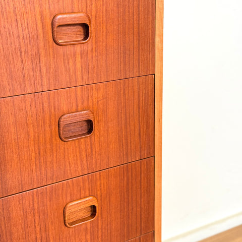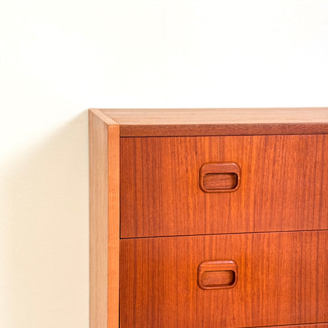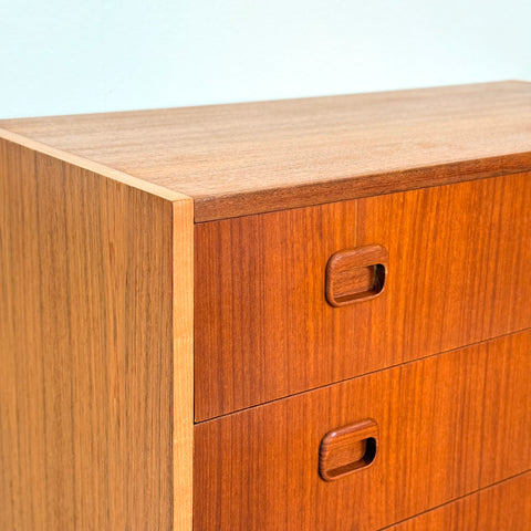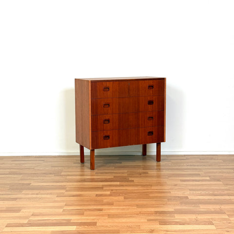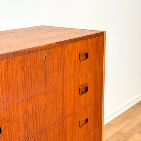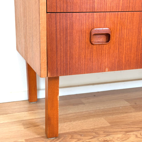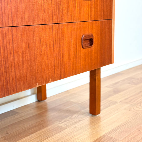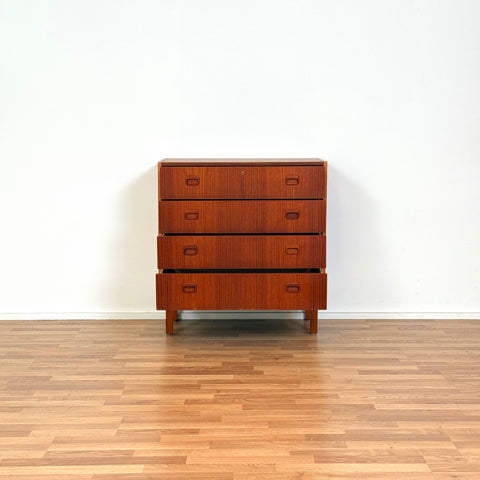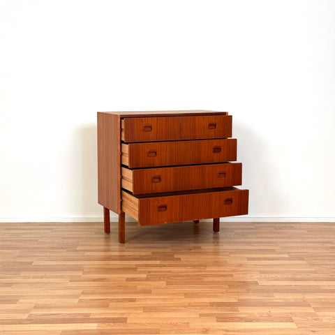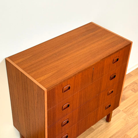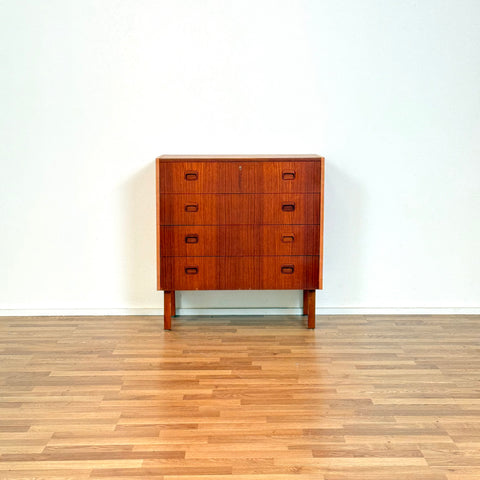 Byrå med 4 lådor tillverkad i Sverige på 1950-60-talet. Den är gjord av teakträ i strukturen och med teakfaner på ovansidan. Den har noggrant restaurerats av vårt team och har behandlats med ett lager av linolja och hårdvaxolja. I restaurerat skick, med märken och repor synliga på ytan och sidorna.