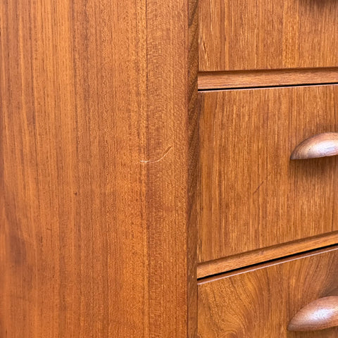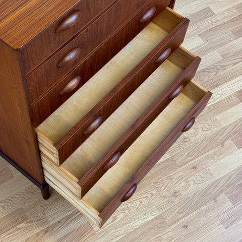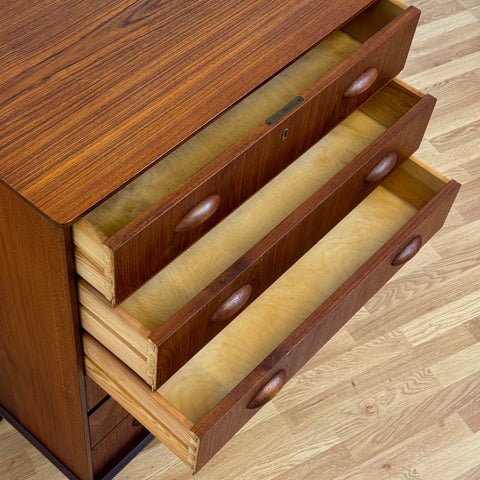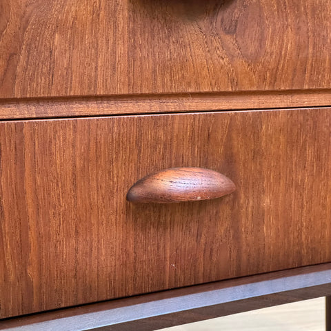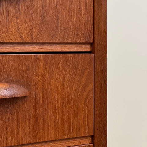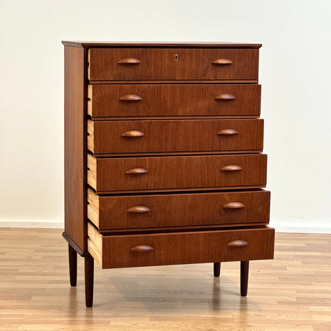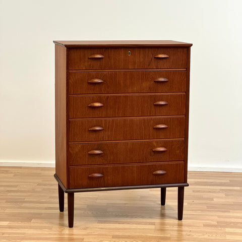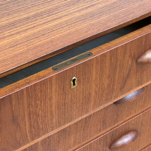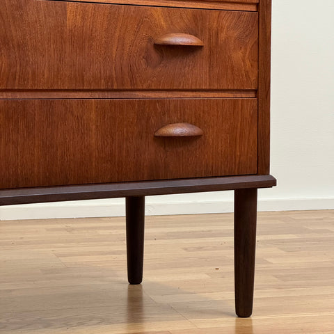 Byrå tillverkad i Danmark på 1950-60-talet. Den är gjord av teakträ i stommen och teakfaner på ovansidan. Byrån har noggrant restaurerats av vårt team och har behandlats med ett lager av linolja och hårdvaxolja. Det är en begagnad vara med användningsspår, såsom små märken och repor. Om du har fler frågor kan du kontakta oss via info@beyovintage.se.