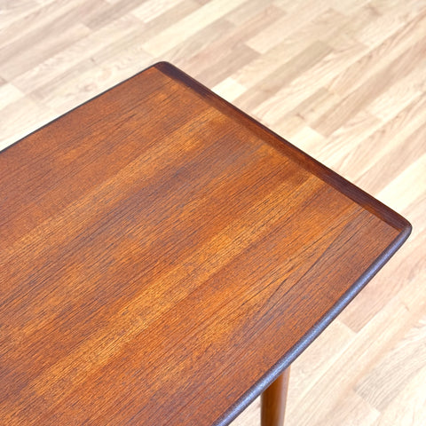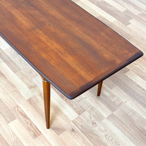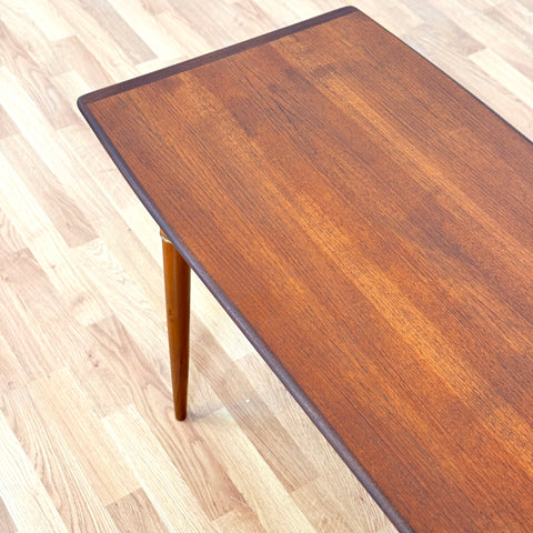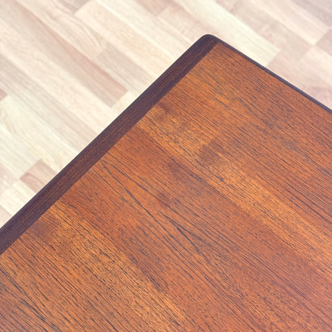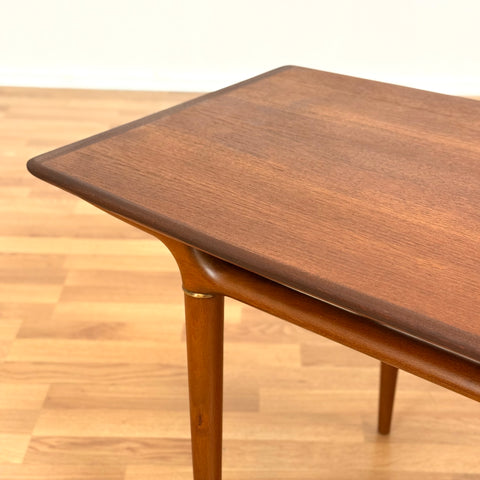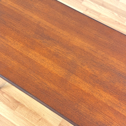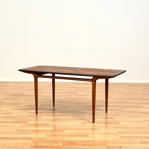Soffbordet tillverkades i Sverige på 1950-60-talet av Björkås Möbelfabrik, Malmbäck. Det är gjort av teakfaner på ovansidan och massivt bokträ på benen, betsade med en mörkare valnötsfinish. Bordet har noggrant restaurerats av vårt team och har behandlats med ett lager av linolja och hårdvaxolja. Bordet är en begagnad vara i restaurerat skick med små spår av användning såsom små repor.