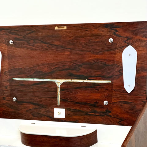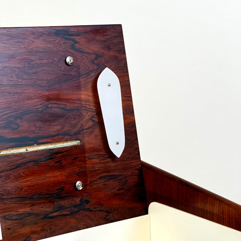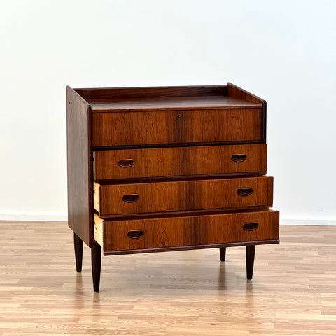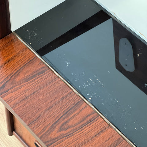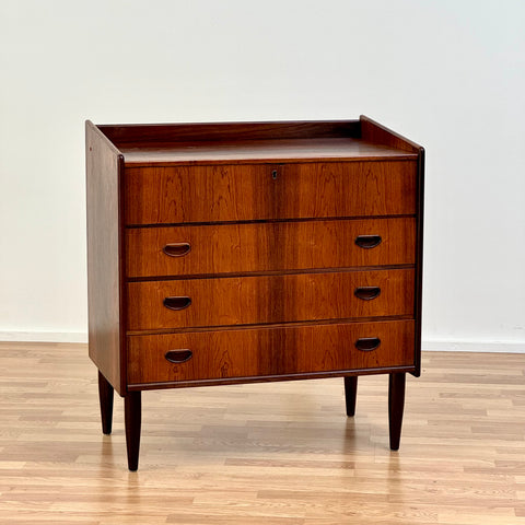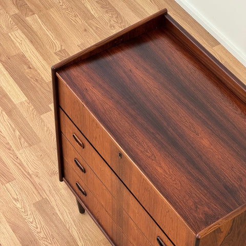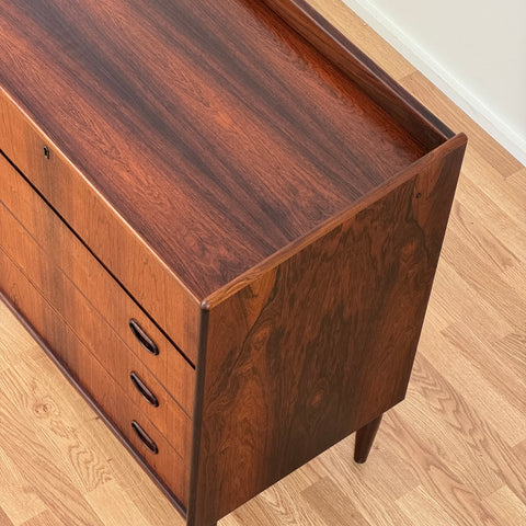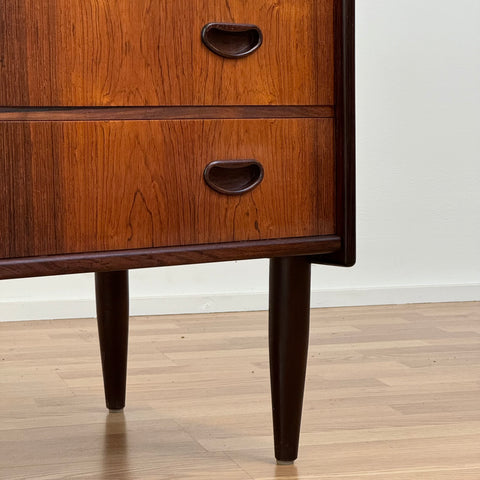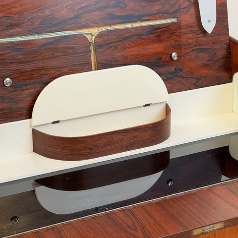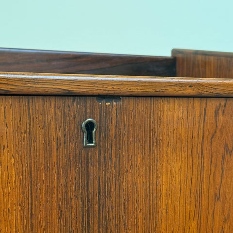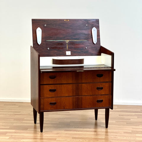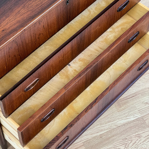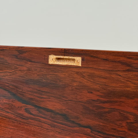 Byrå tillverkad i Danmark på 1950-60-talet. Den är gjord av santos rosenträ. Byrån har noggrant restaurerats av vårt team och har behandlats med ett lager av linolja och hårdvaxolja. Tyvärr saknas spegeln. Det är en begagnad vara med användningsspår, såsom små märken och repor. Om du har fler frågor kan du kontakta oss via info@beyovintage.se.