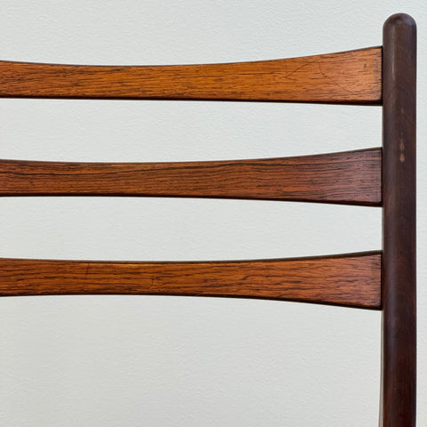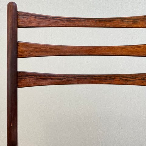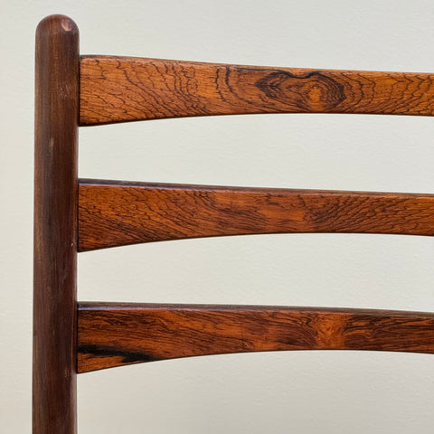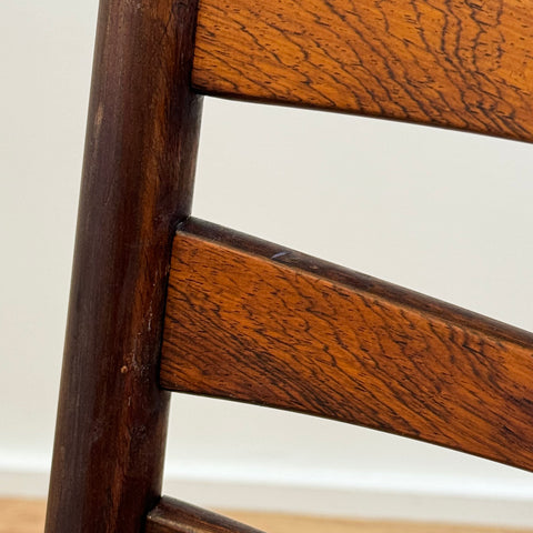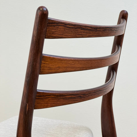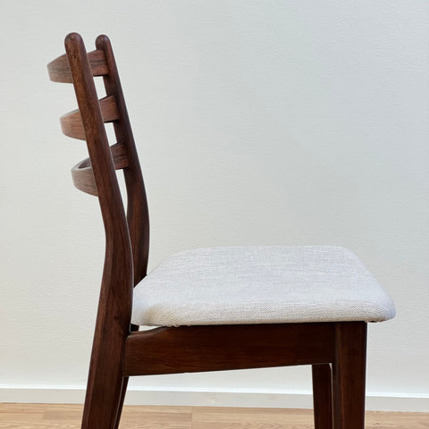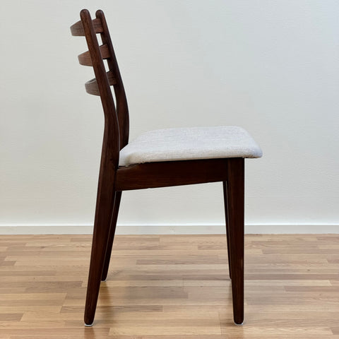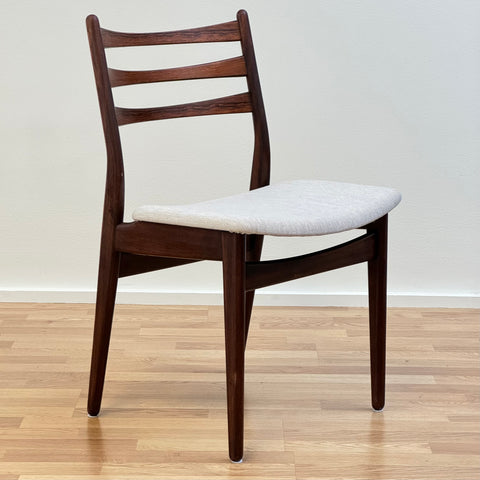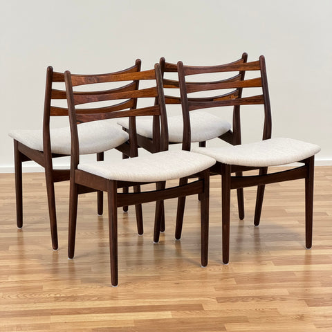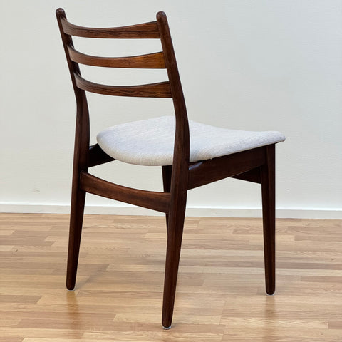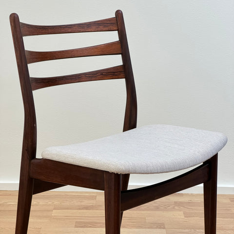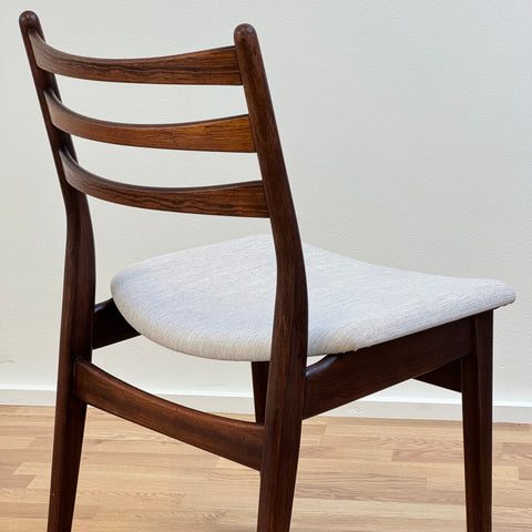 Set om fyra stolar tillverkade i Danmark på 1950-60-talet. Stolarna är gjorda av massivt trä i konstruktionen och rosenträfanér på ryggstödet. Stolarna har blivit helt renoverade och omklädda av vårt team. Stoppningen har bytts ut och vi har valt ett x-tyg för dessa möbler. De säljs som ett set om 4 och priset är per styck, för att se tillgänglighet av fler av samma stolar vänligen kontakta oss via info@beyovintage.se