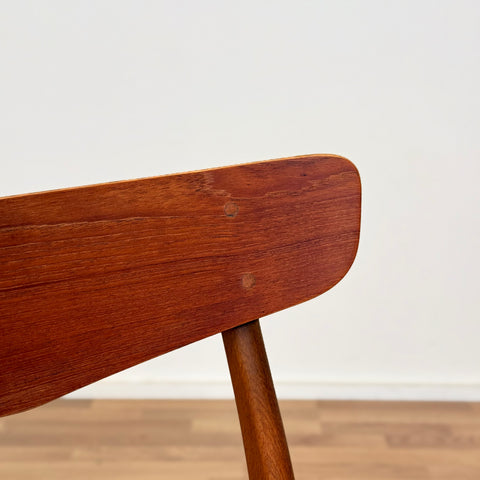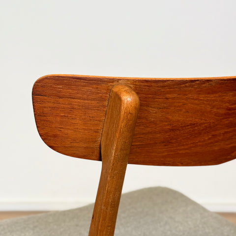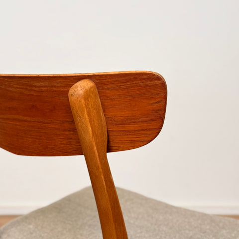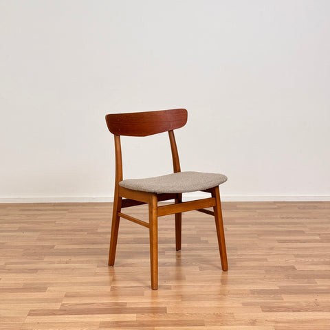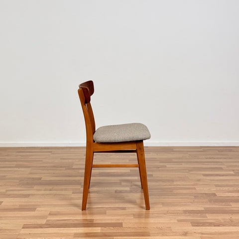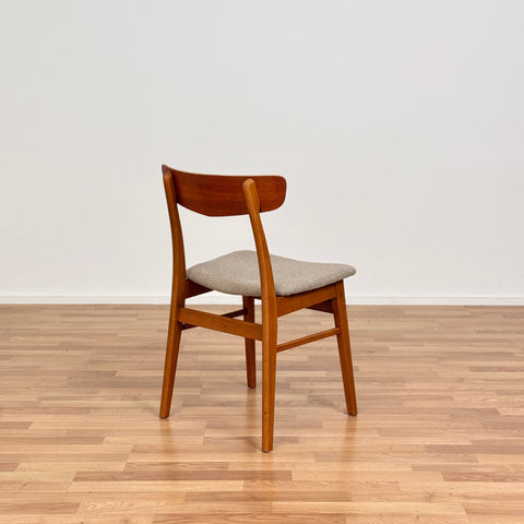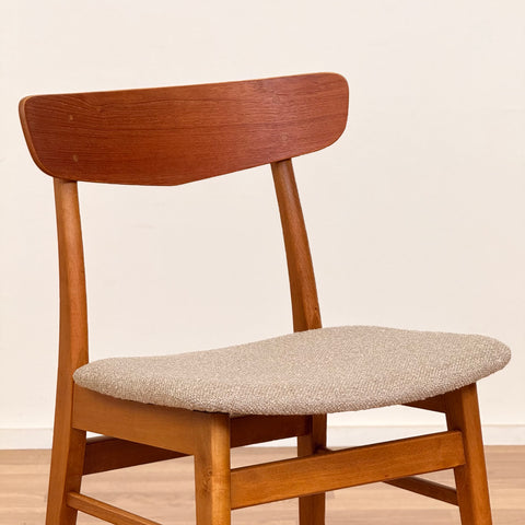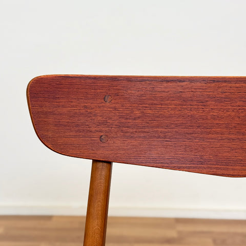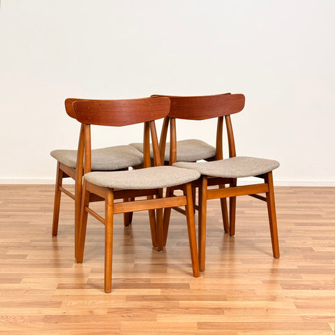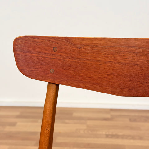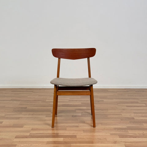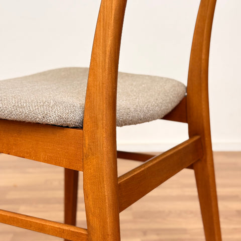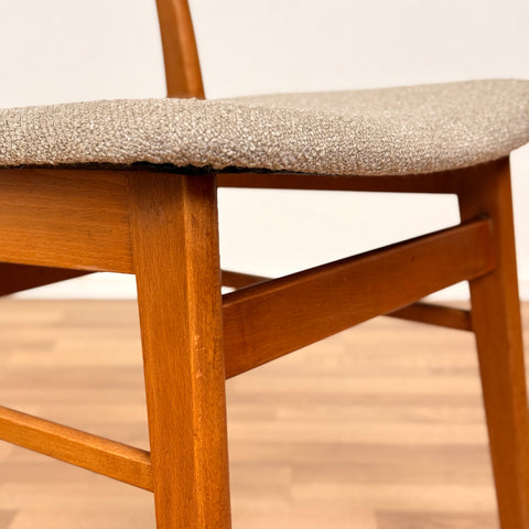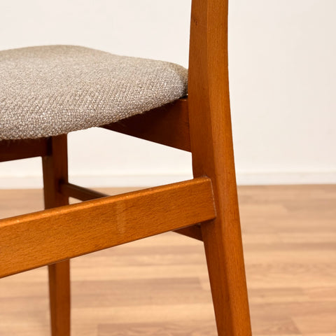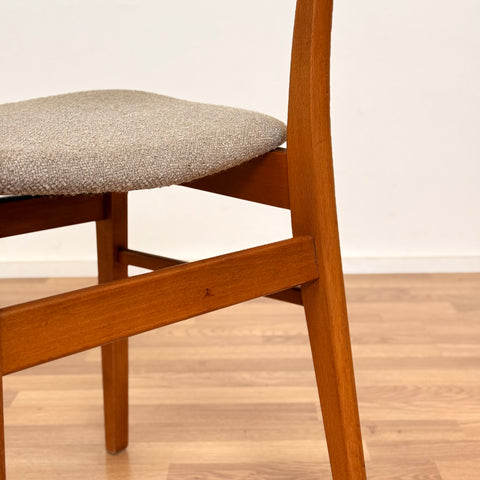Set om 4 matstolar tillverkade i Danmark på 1950-60-talet av Findahl. Stolarna är gjorda av teakfaner på ryggstödet och bok på strukturen. Stolarna har restaurerats och omklätts av vårt team. Stoppningen har bytts ut, och vi har valt ett beige tyg till dessa exemplar. De säljs som ett set om 4 och priset är per set.