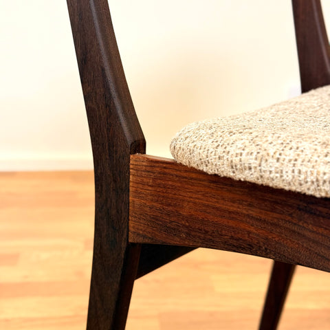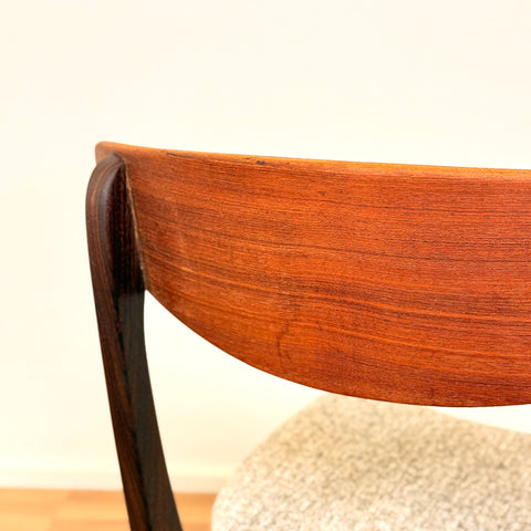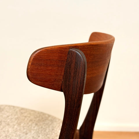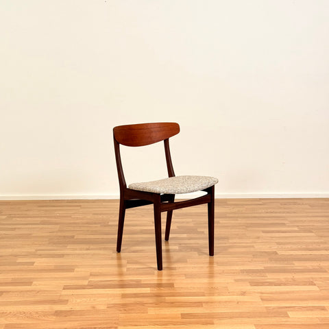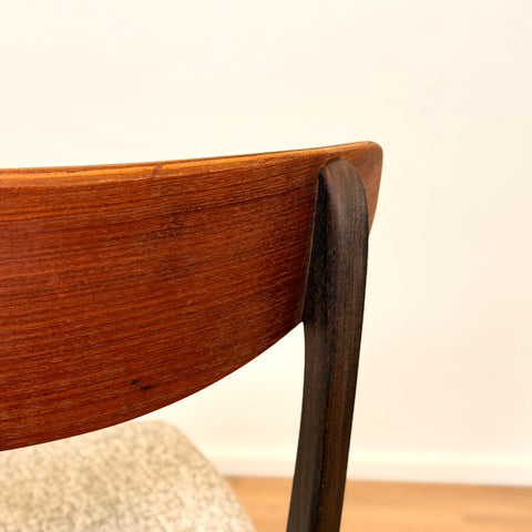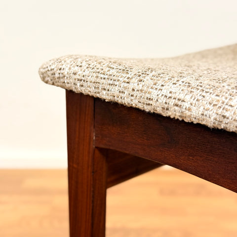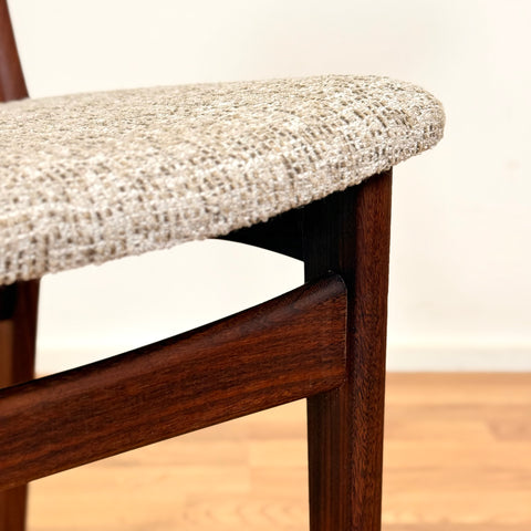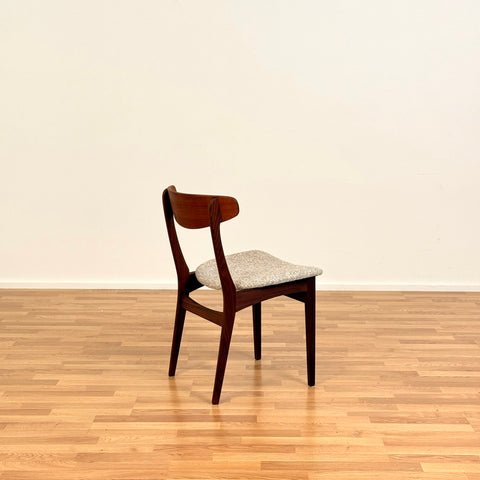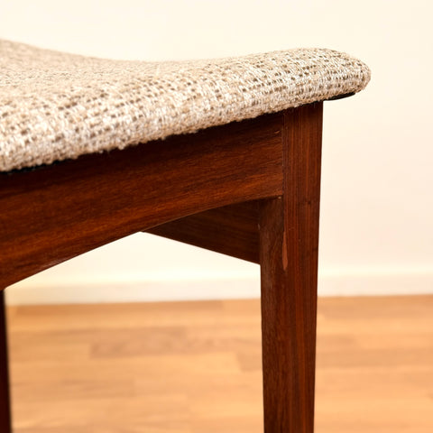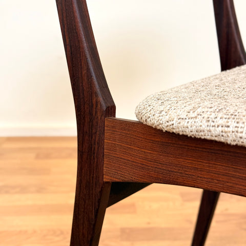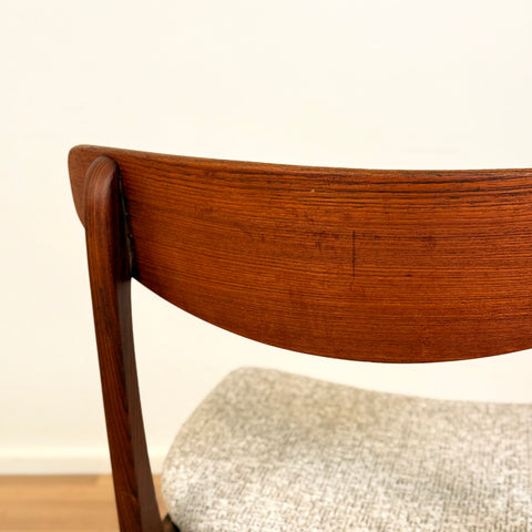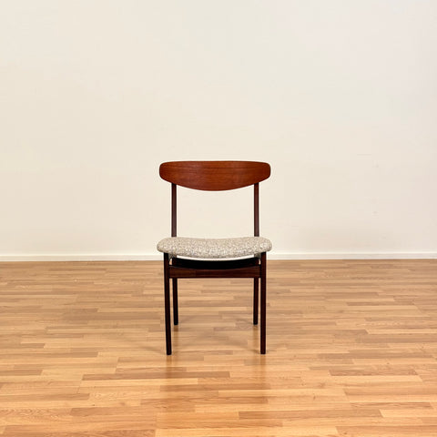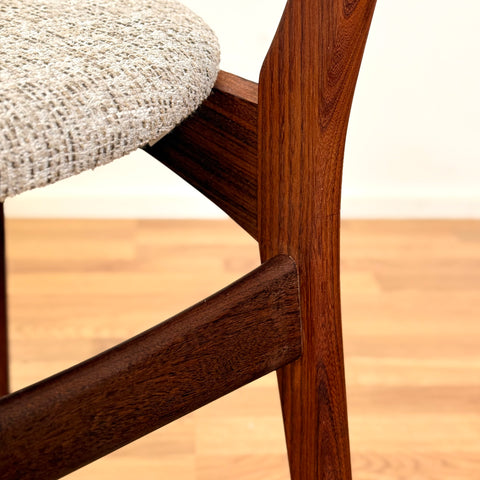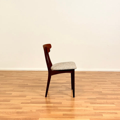 Set om 8 matstolar tillverkade i Danmark på 1950-60-talet. Stolarna är gjorda av teakträ på strukturen och på ryggstödet. Stolarna har restaurerats och omklätts av vårt team. Stoppningen har bytts ut, och vi har valt ett grått tyg till dessa delar. De säljs som ett set om 6 och priset är per set.