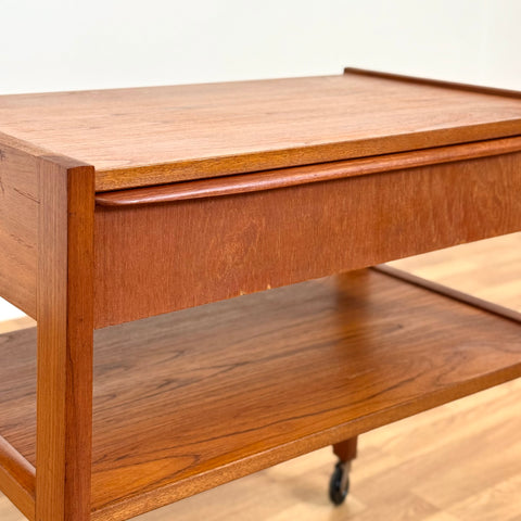 Rullvagnen tillverkades i Danmark på 1950-60-talet av Sika møbler. Den är gjord av teakträ och fanerad på ovansidan. Rullvagnen har noggrant restaurerats av vårt team och har behandlats med ett lager av linolja och hårdvaxolja. Bordet är en begagnad vara i restaurerat skick med små användningsspår såsom små repor.