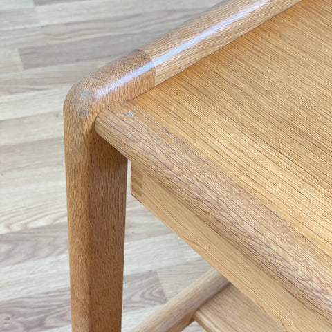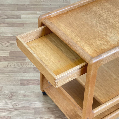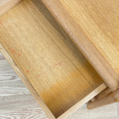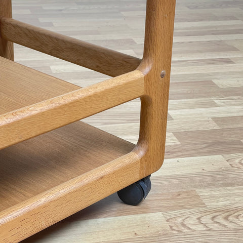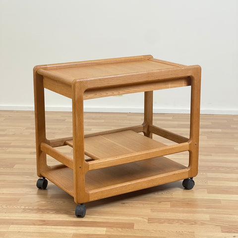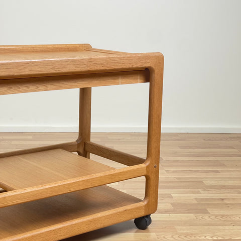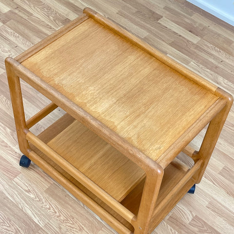 Vagn tillverkad i Danmark på 1950-60-talet av Vildbjerg Møbelfabrik. Den är gjord av ekträ i konstruktionen och ekfaner på ovansidan. Bordet har noggrant restaurerats av vårt team och har behandlats med ett lager av linolja och hårdvaxolja. Bordet är en begagnad vara med spår av användning, såsom små märken och repor. Om du har fler frågor kan du kontakta oss via info@beyovintage.se.