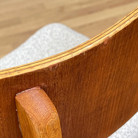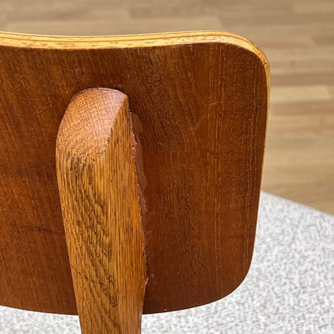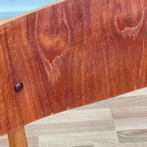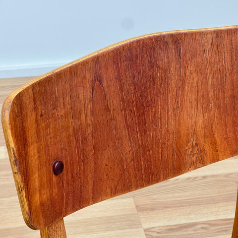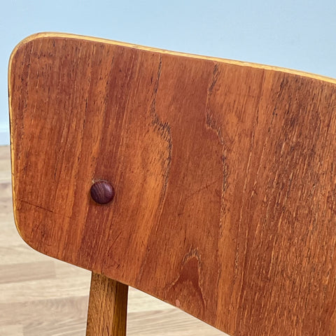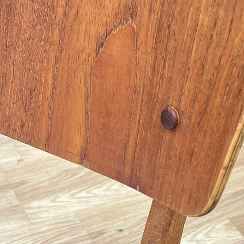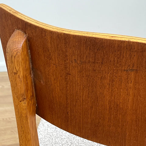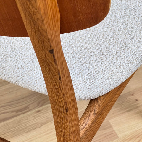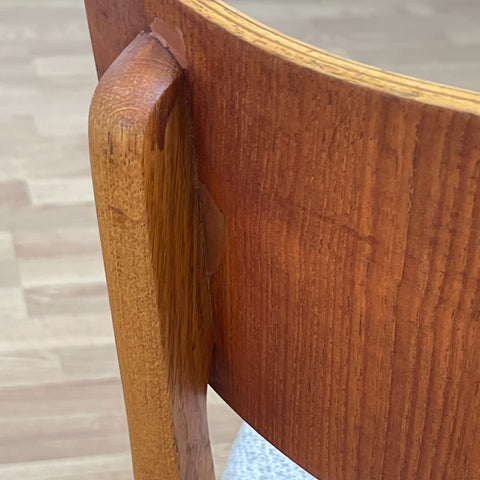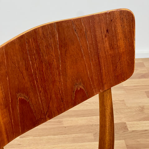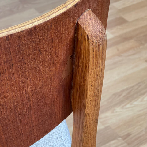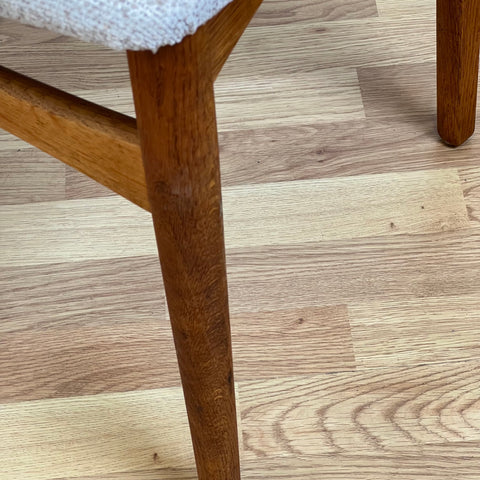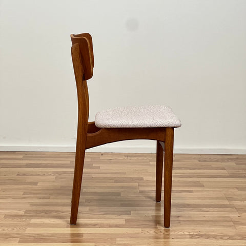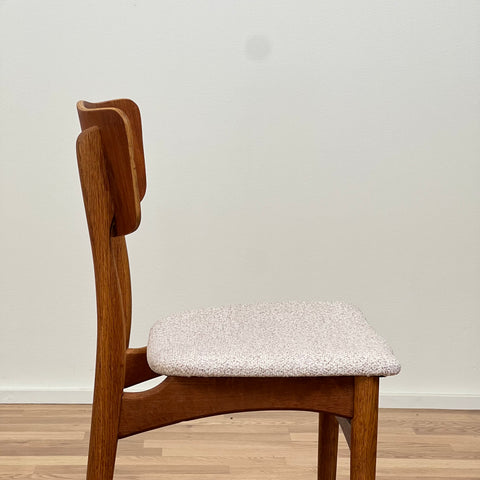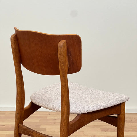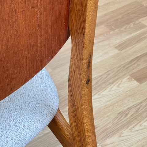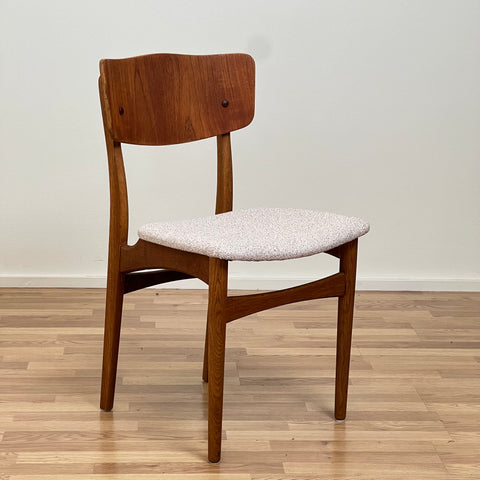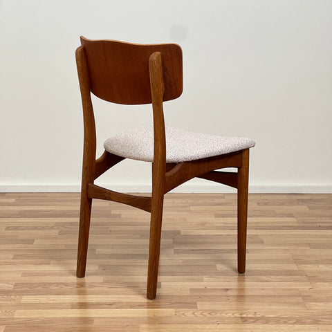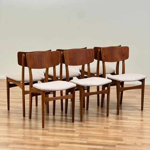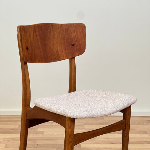 Set om 6 stolar tillverkade i Danmark på 1950-60-talet. Stolarna är gjorda av teakträ i strukturen och teakträ i ryggstödet. Stolarna har blivit helt restaurerade och omklädda av vårt team. Stoppningen har bytts ut och vi har valt ett tyg för dessa möbler. De säljs som ett set om 6 och priset är per styck, för att se tillgänglighet av fler av samma stolar vänligen kontakta oss via info@beyovintage.se.
