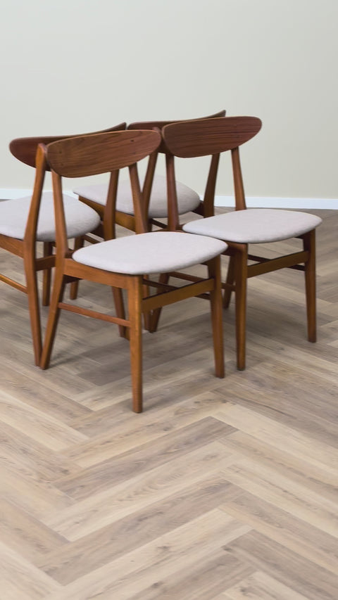 Set of 4 chairs manufactured in Denmark in the 1950s by Farstrup, model 210. The chairs are made of beech wood on the structure and teak veneer on the backrest. The chairs have been restored and reupholstered by our team. The padding has been changed, and we choose a grey and orange fabric for these pieces. They are sold as a set of 4 and the price is per set.