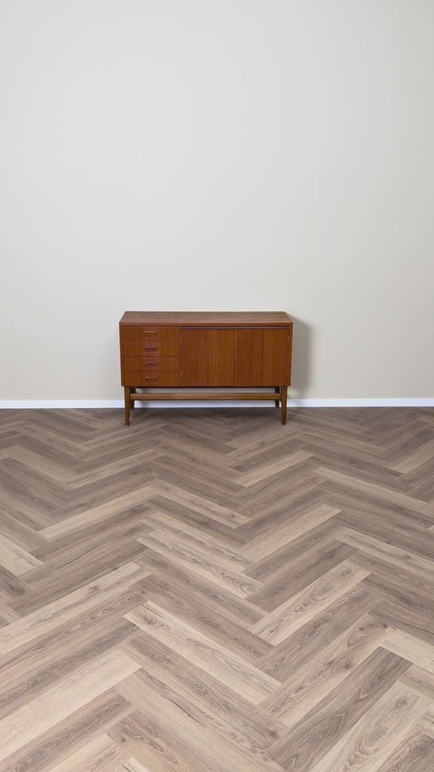 Sideboard manufactured in Sweden in the 1950s-60s. It is made of teak veneer on the structure and solid beech wood on the legs. The sideboard has been carefully restored by our team and has been treated with a layer of ground oil and hard wax oil. The table is a used item in restored condition with marks and scratches visible on the surface and sides.