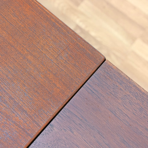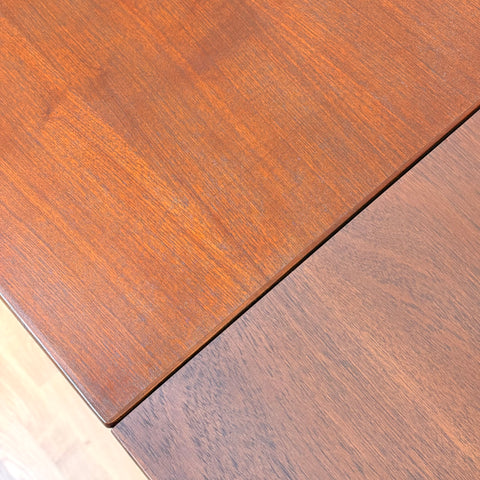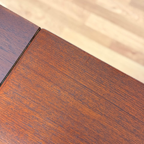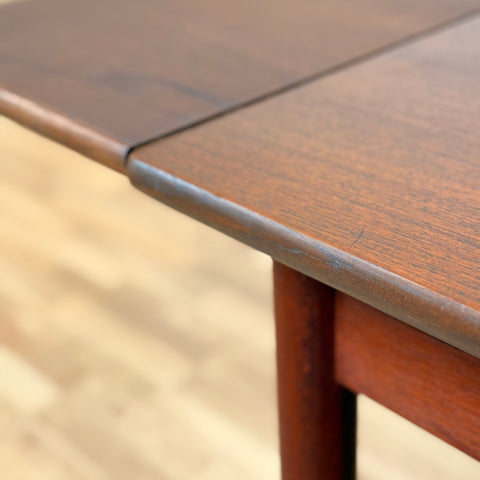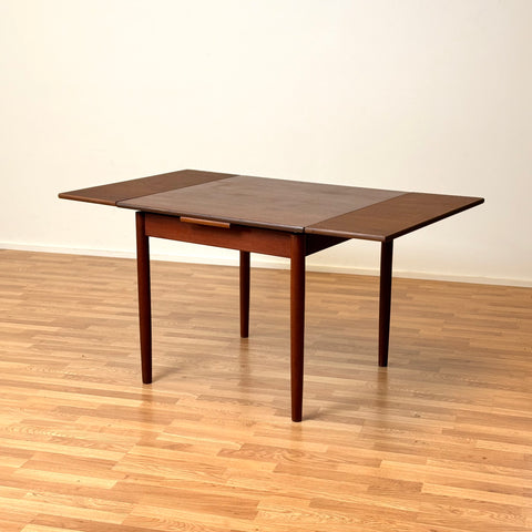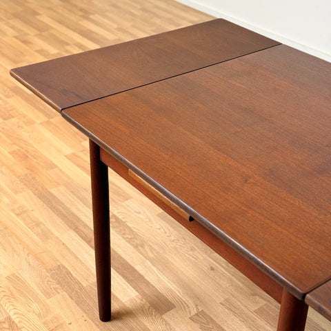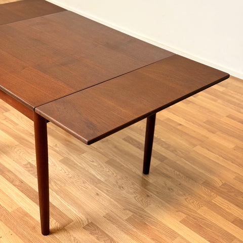 The dining table was manufactured in Denmark in 1950s-60s. It is made of teak veneer on the top surface and in solid teak wood on the structure. The dining table has been carefully restored by our team and has been treated with a layer of ground oil and hard wax oil. The table is a used item in restored condition with small traces of use such as small scratches.