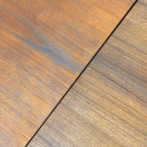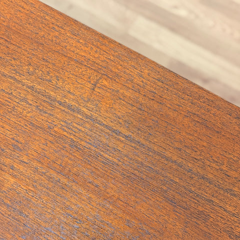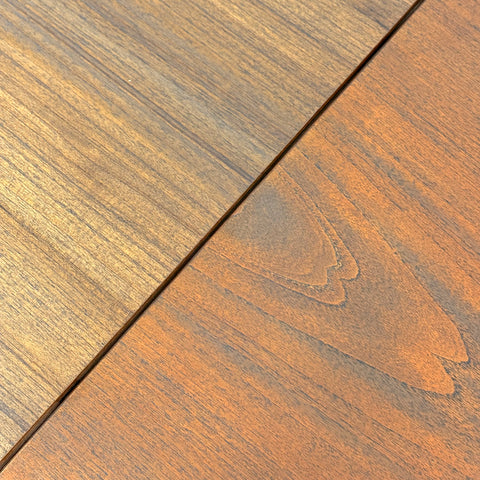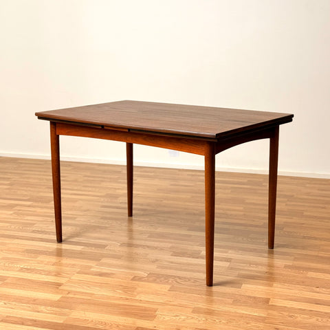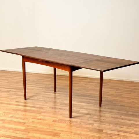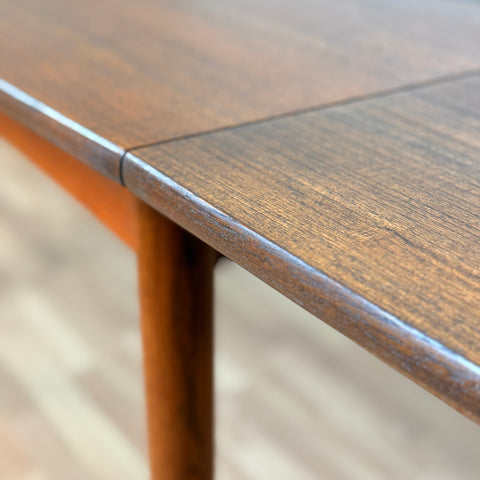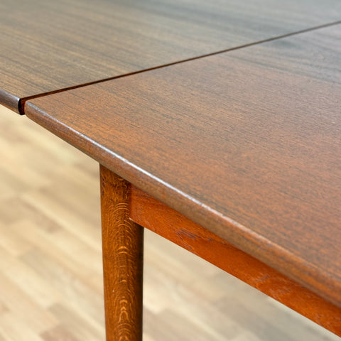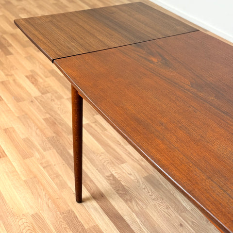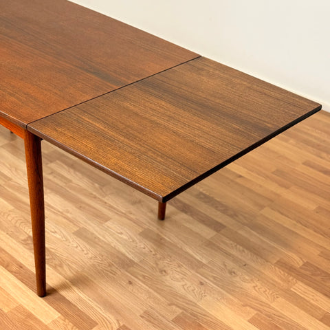 The dining table was manufactured in Denmark in 1950s-60s. It is made of teak veneer on the top surface and in solid teak wood on the structure, stained with walnut finish. The dining table has been carefully restored by our team and has been treated with a layer of ground oil and hard wax oil. The table is a used item in restored condition, with marks and scratches visible on the surface and sides.