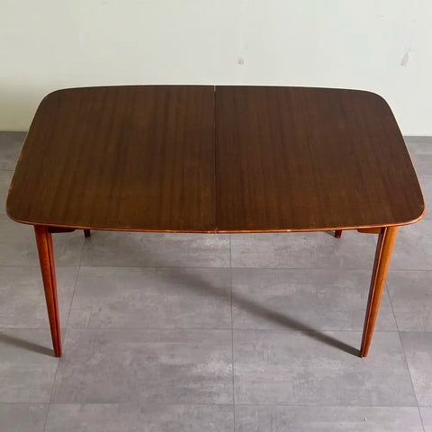 Dining table in mahogany with three small extension boards. The extension boards are in another wood but are stained to darker color. The table is in good condition with some minor mistakes on the wood. Can be easily extended and stable with and without the extension boards.