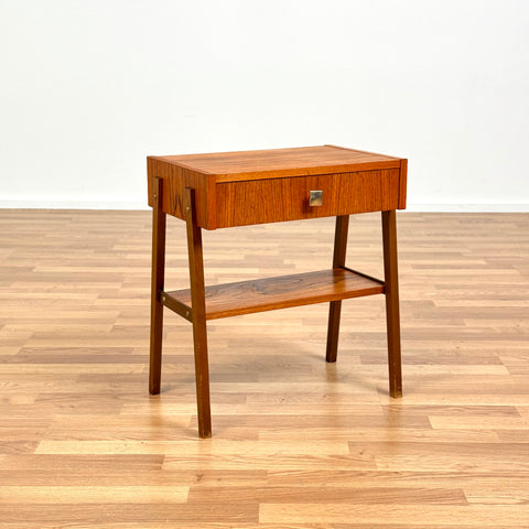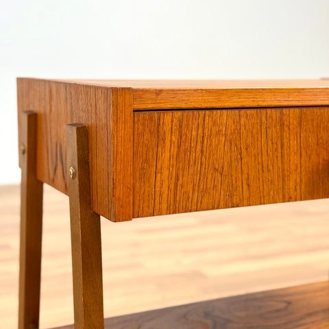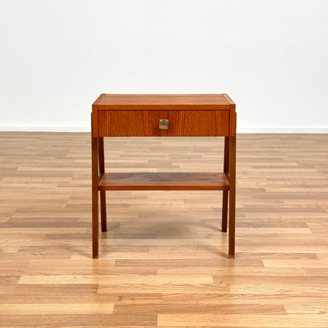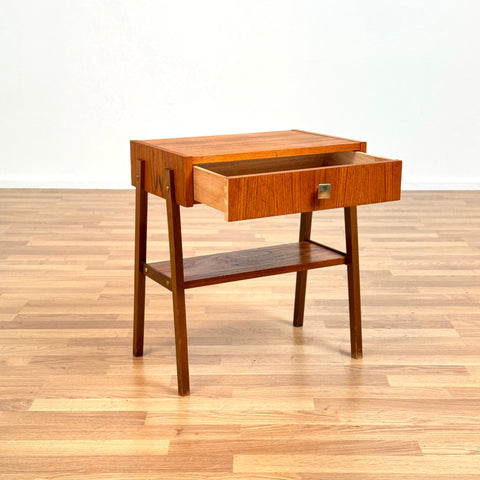 The nightstand was manufactured in Denmark in the 1950s-60s. It is made of teak on the structured and teak veneered on the top surface. The dining table has been carefully restored by our team and has been treated with a layer of ground oil and hard wax oil. The table is a used item in restored condition with small traces of use such as small scratches.