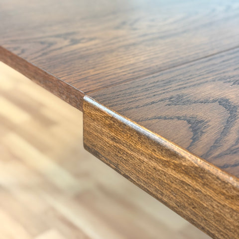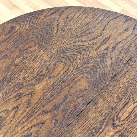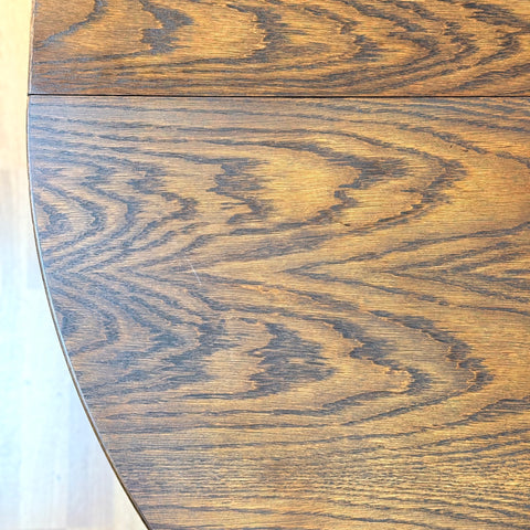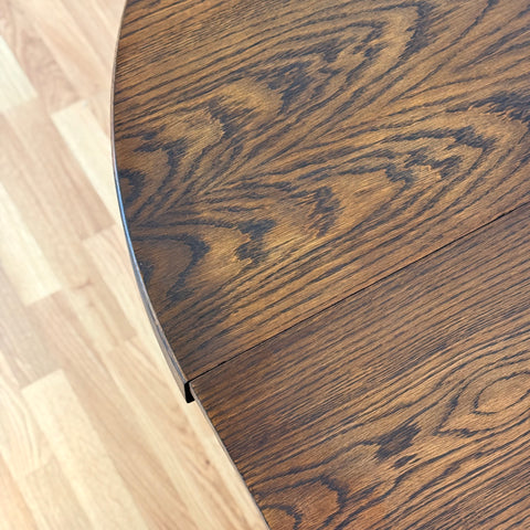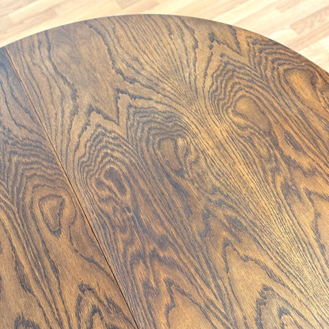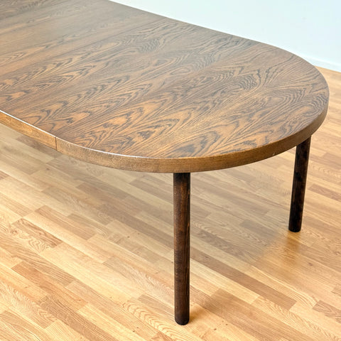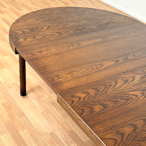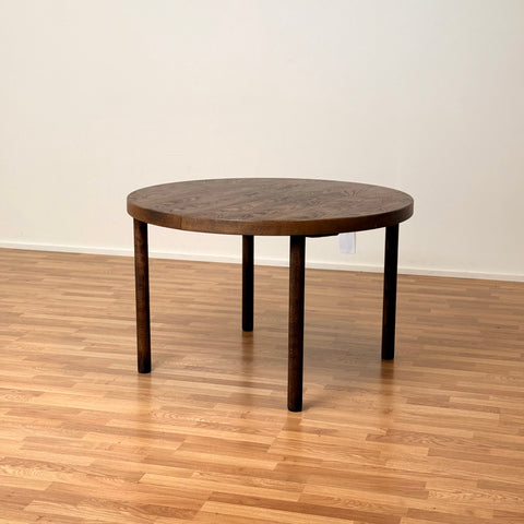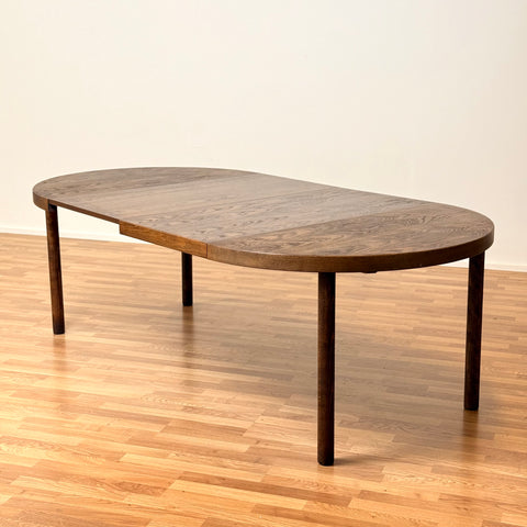 Dining table was manufactured in Denmark in the 1950s-60s. It is made of oak veneer on top surface. The dining table has been carefully restored by our team and has been treated with a layer of ground oil and hard wax oil. The table is a used item in restored condition with small traces of use such as small scratches.