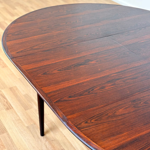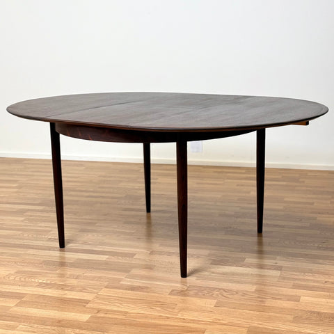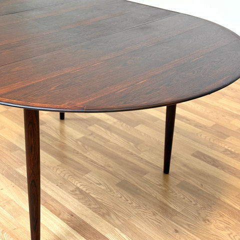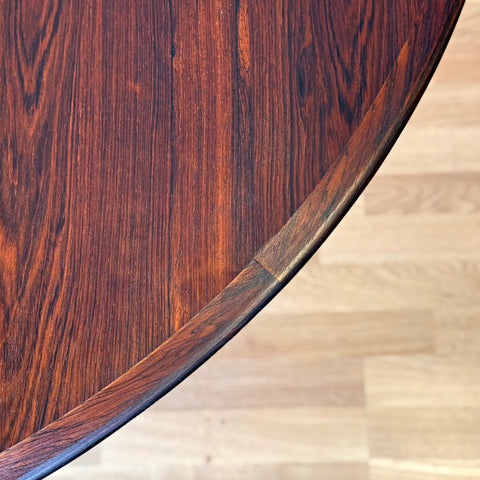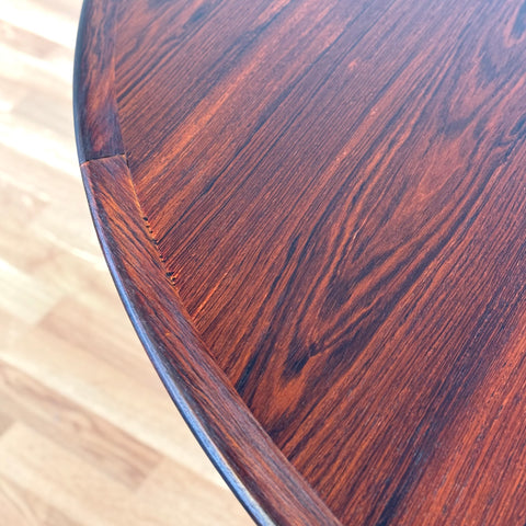 Dining table was manufactured in Denmark in the 1950s-60s. It is made of santos rosewood veneer on the top surface and on the structure. The dining table has been carefully restored by our team and has been treated with a layer of ground oil and hard wax oil. The table is a used item in restored condition with small traces of use such as small scratches and a small veneer damage.