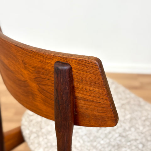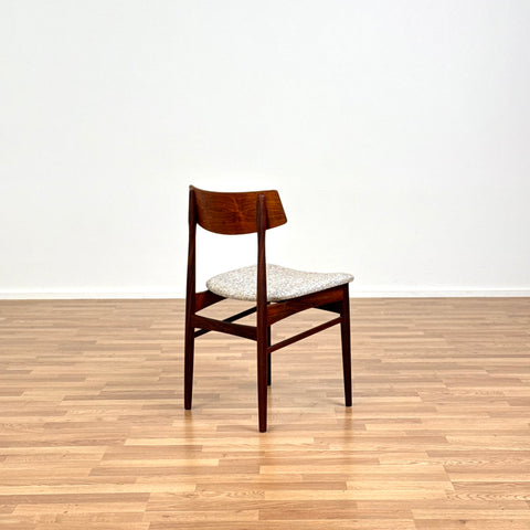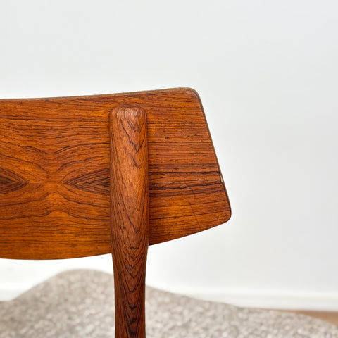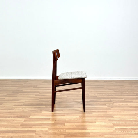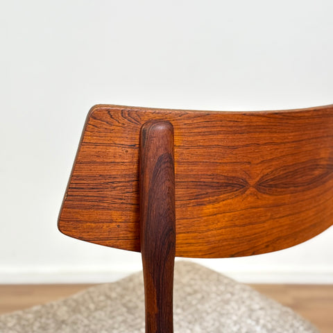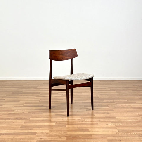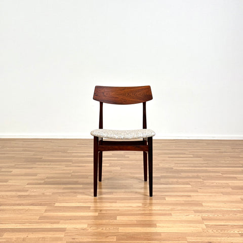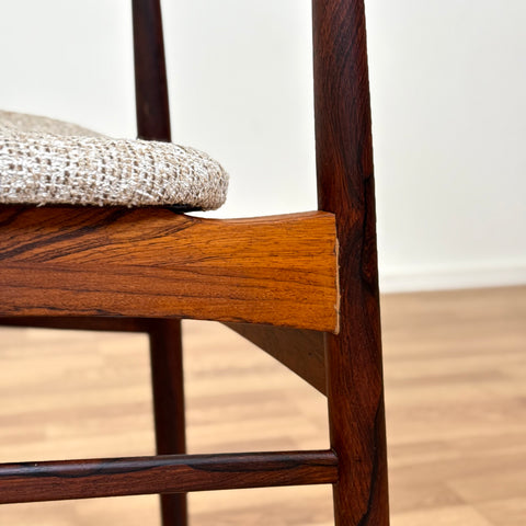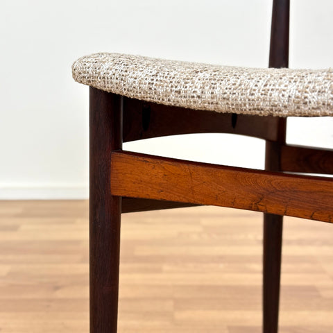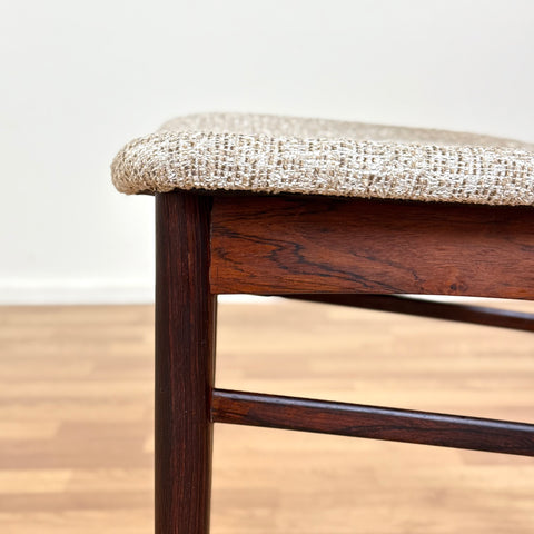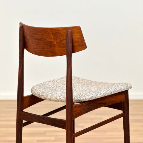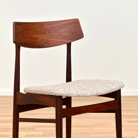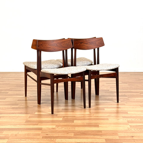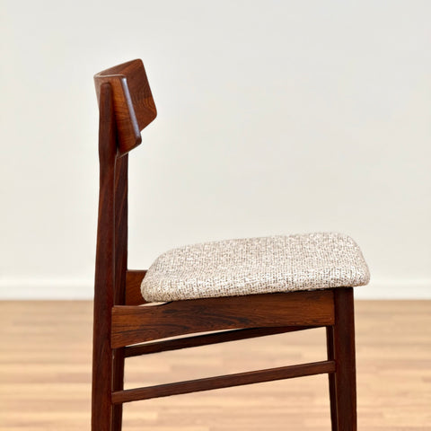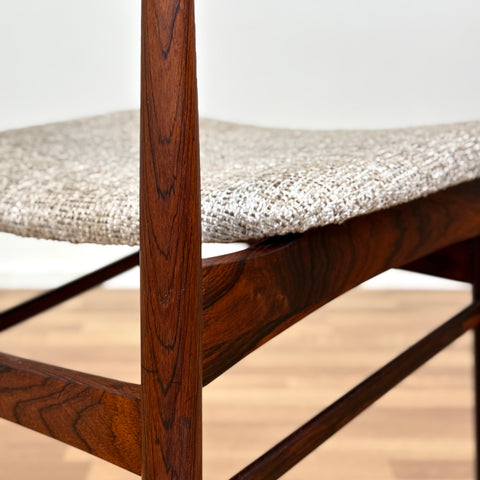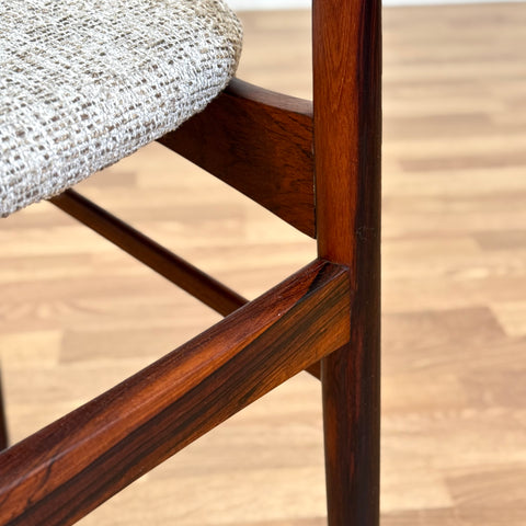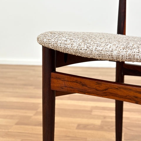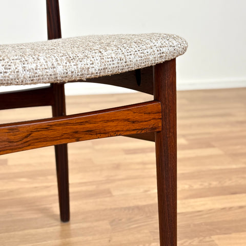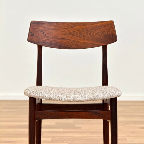Set of 4 chairs manufactured in Denmark in the 1950s-60s. The chairs are made of santos rosewood on the structure and rosewood on the backrest. It has been fully restored and reupholstered by our team. The padding has been changed, and we choose a beige fabric for this piece. They are sold as a set of 4 and the price is per piece.