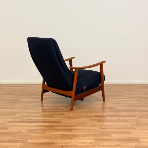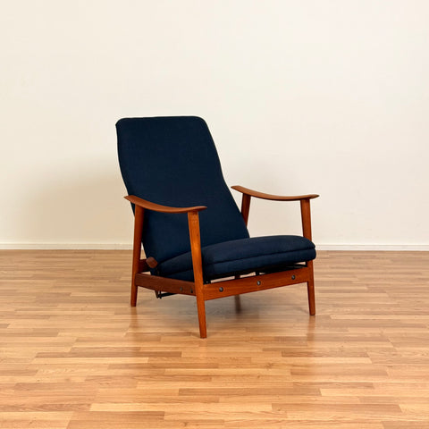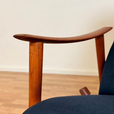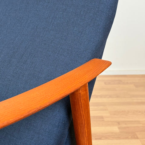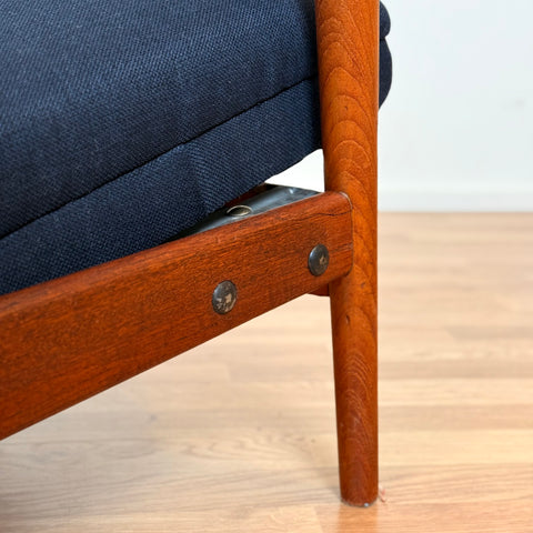 Sillón fabricado en Noruega en los años 1950-60 por Stokke Møbelfabrikk. El sillón está hecho de teca maciza en la estructura. En estado restaurado, con pequeñas señales de uso como pequeños arañazos visibles en la madera. El acolchado ha sido cambiado, y hemos elegido una tela azul oscuro para estas piezas.
