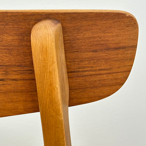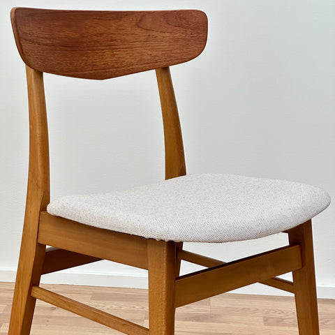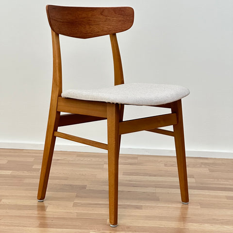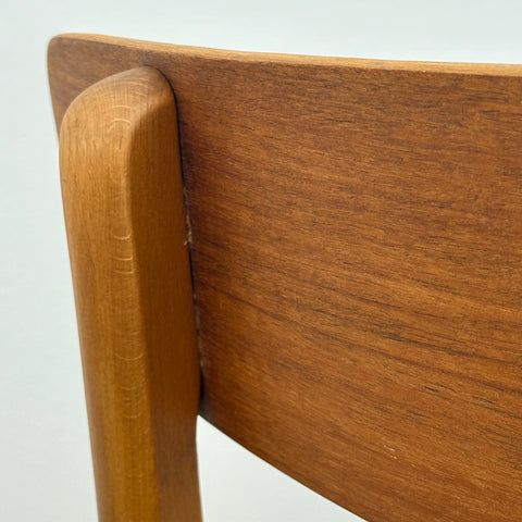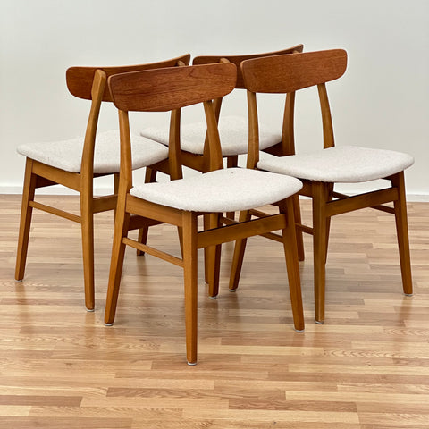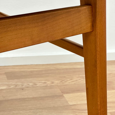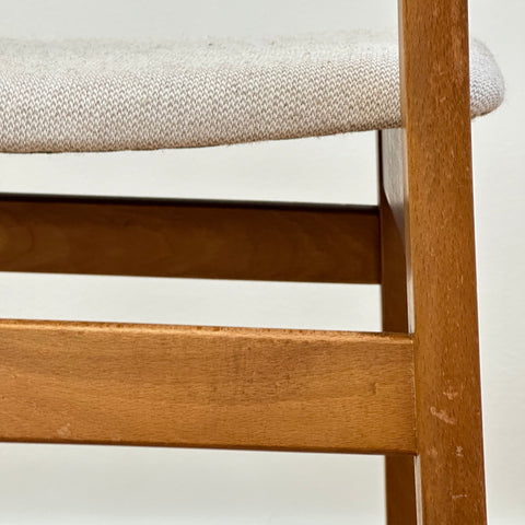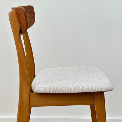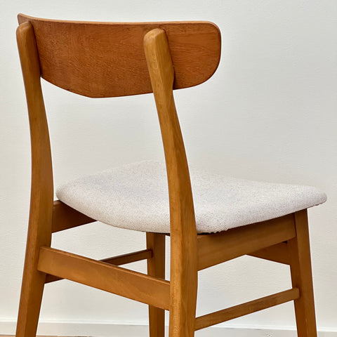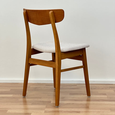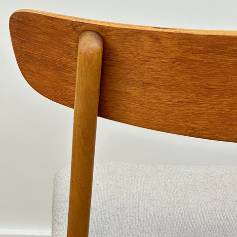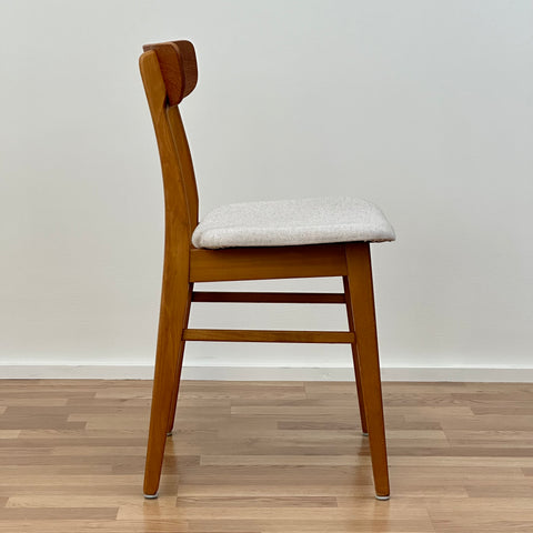 Conjunto de 4 sillas fabricadas en Dinamarca en los años 1950-60 por Findahl. Las sillas están hechas de madera maciza de haya en la estructura y madera de teca en el respaldo. Las sillas han sido completamente restauradas y retapizadas por nuestro equipo. El acolchado ha sido cambiado y hemos elegido una tela beige claro para estas piezas. Las sillas tienen algunos pequeños arañazos y decoloración, pero están en buen estado y son estables. Se venden como un conjunto de 4 y el precio es de 2800kr por pieza. Para consultar la disponibilidad de más sillas iguales, por favor contáctenos a través de info@beyovintage.se.