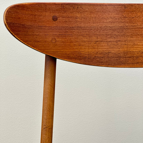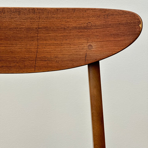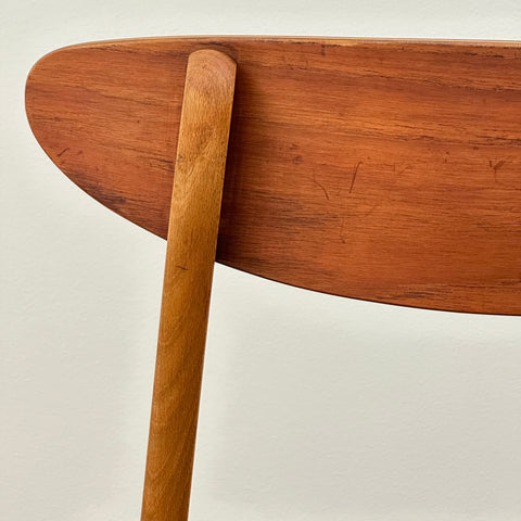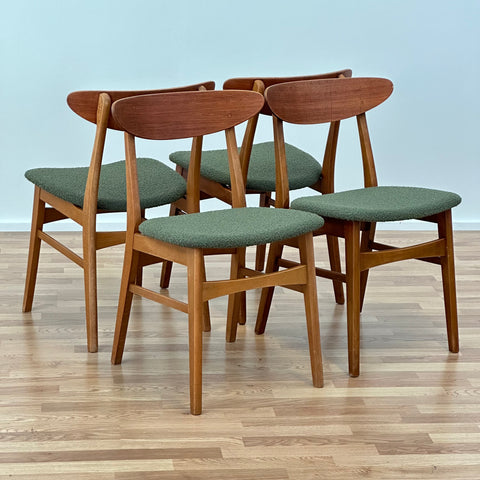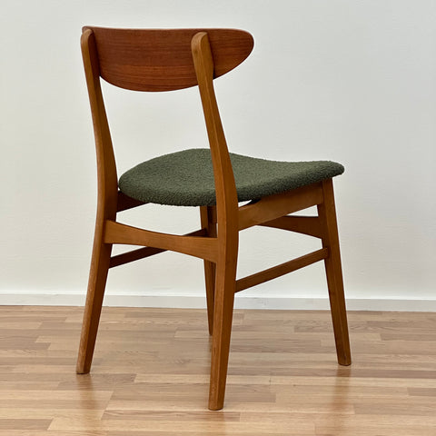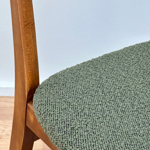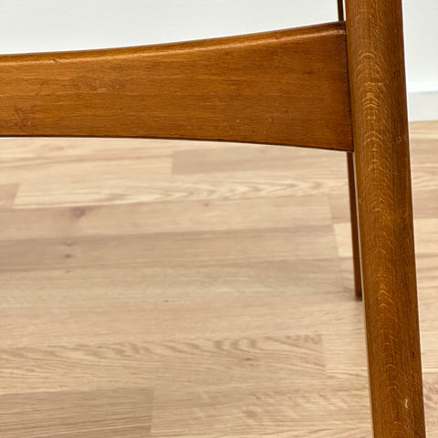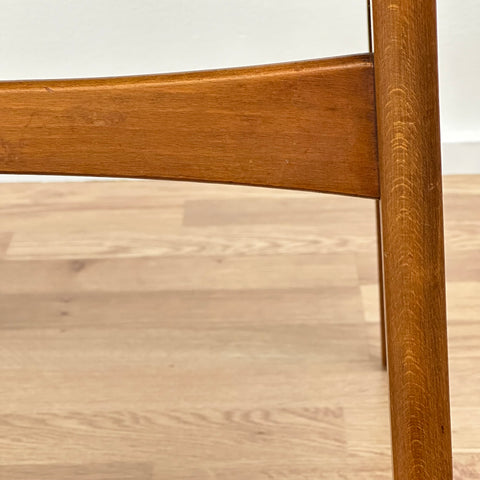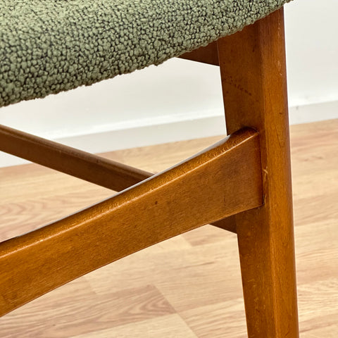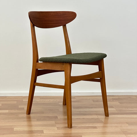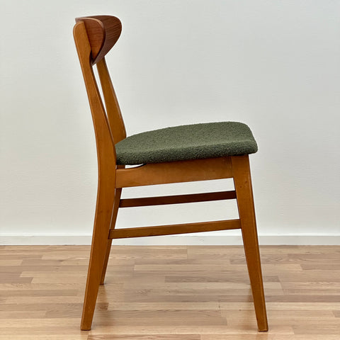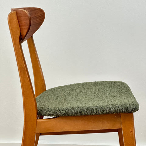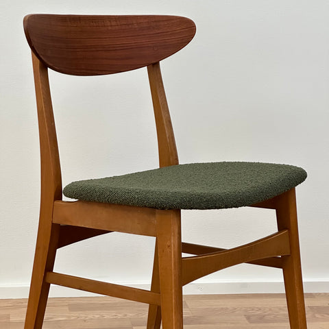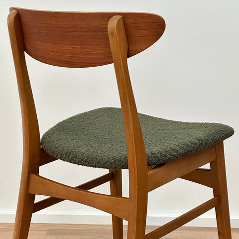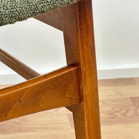 Ensemble de 4 chaises fabriquées au Danemark dans les années 1950-60 par Findahl. Les chaises sont en bois de hêtre massif pour la structure et en bois de teck pour le dossier. Les chaises ont été entièrement restaurées et retapissées par notre équipe. Le rembourrage a été changé et nous avons choisi un tissu vert clair pour ces pièces. Les chaises présentent quelques petites rayures et décolorations, mais sont en bon état et stables. Elles sont vendues par lot de 4 et le prix est de 2800kr par pièce, pour connaître la disponibilité de plus de chaises identiques, veuillez nous contacter via info@beyovintage.se.