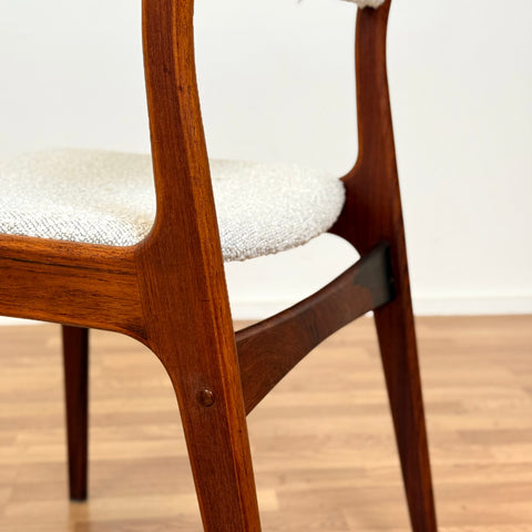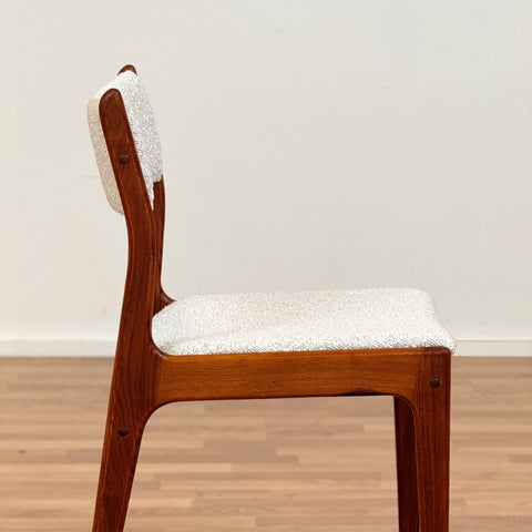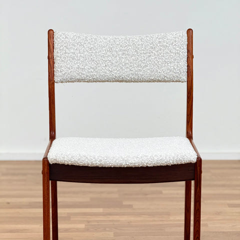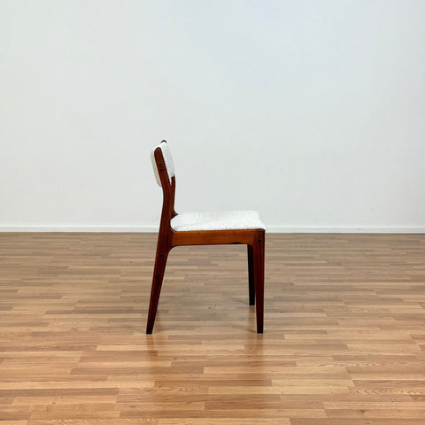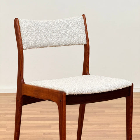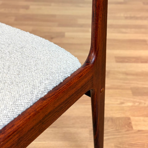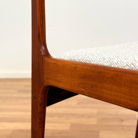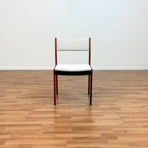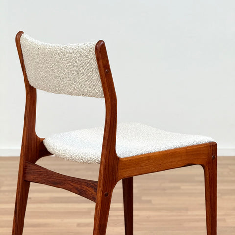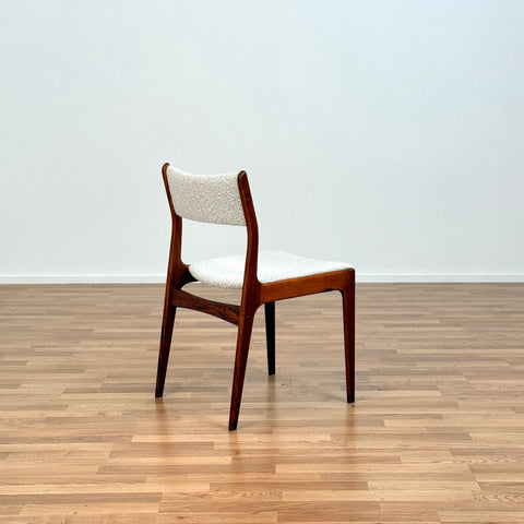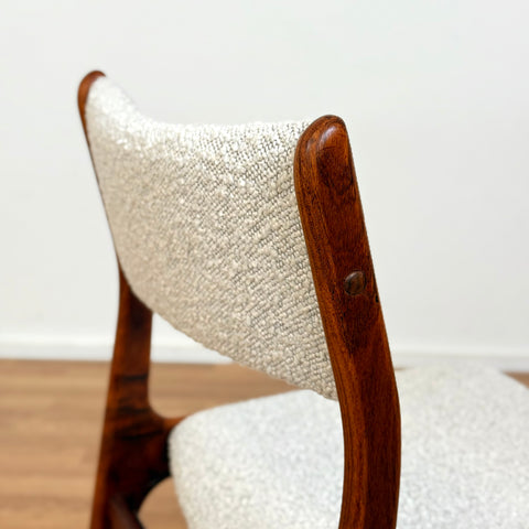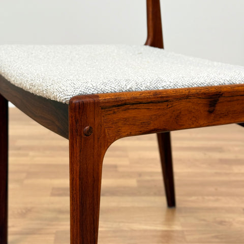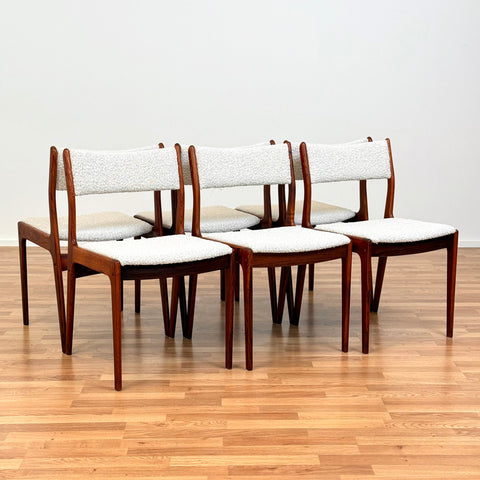 Ensemble de 6 chaises fabriquées au Danemark dans les années 1950-60, par Uldum Mobelfabrik. Les chaises sont en palissandre Santos pour la structure. Les chaises ont été restaurées et retapissées par notre équipe. Le rembourrage a été changé, et nous avons choisi un tissu bouclé écru pour ces pièces. Elles sont vendues en lot de 6 et le prix est à l’unité.