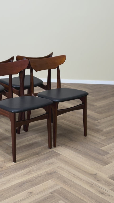 Set med 4 matstolar tillverkade i Danmark på 1960-70-talet av Schiønning & Elgaard. Stolarna är gjorda av teakfaner på ryggstödet och massivt valnötsträ i konstruktionen. Stolarna har restaurerats och omklätts av vårt team. Stoppningen har bytts ut, och vi har valt ett läder i dessa exemplar. De säljs som ett set om 4 och priset är per set.