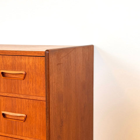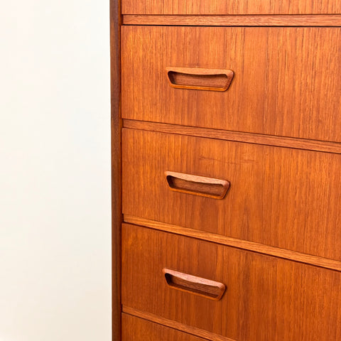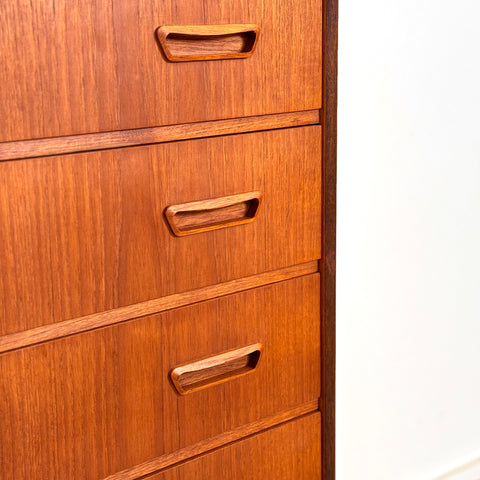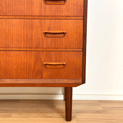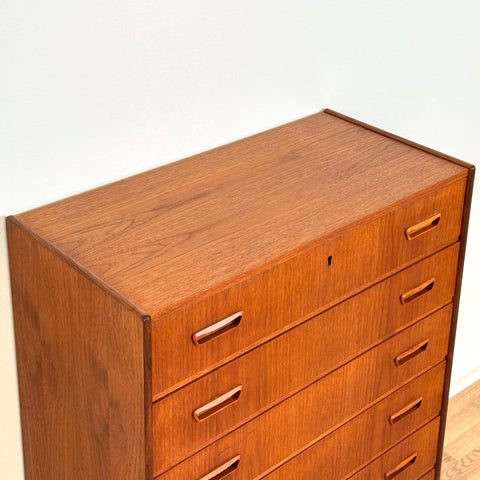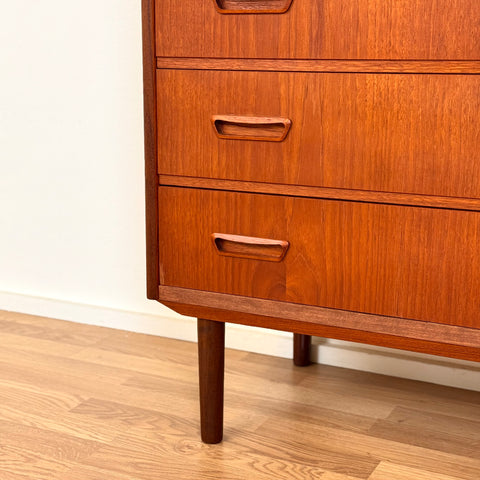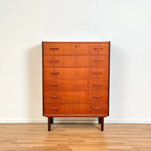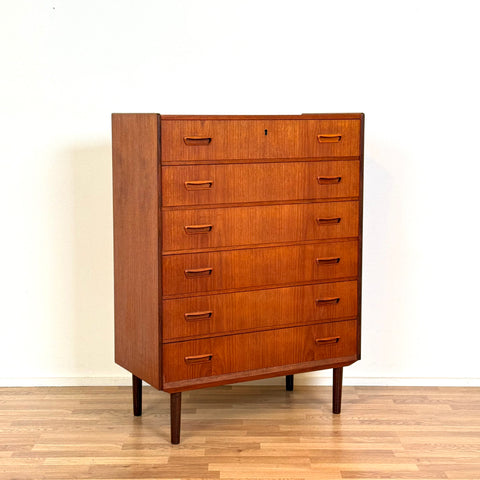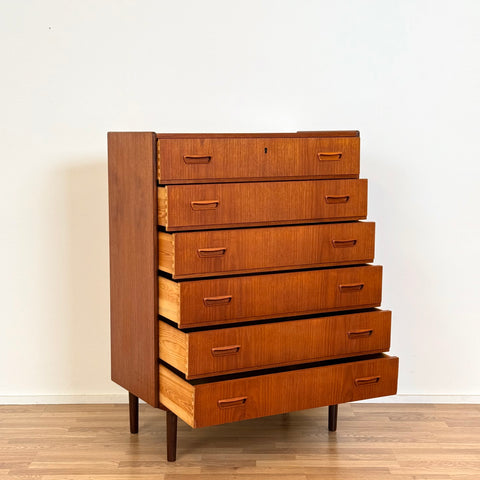 Byrå med 6 lådor tillverkad i Danmark på 1950-60-talet. Den är gjord av teakträ i strukturen och med teakfaner på ovansidan. Den har noggrant restaurerats av vårt team och har behandlats med ett lager av linolja och hårdvaxolja. I restaurerat skick, med märken och repor synliga på ytan och sidorna.