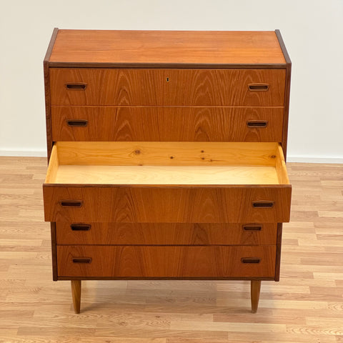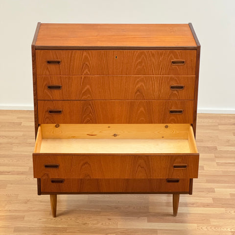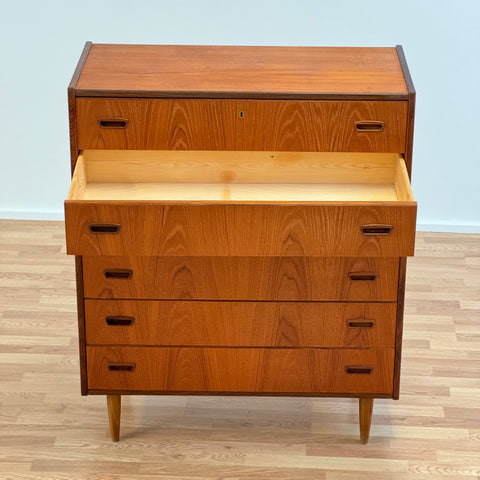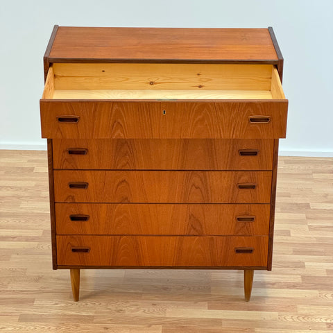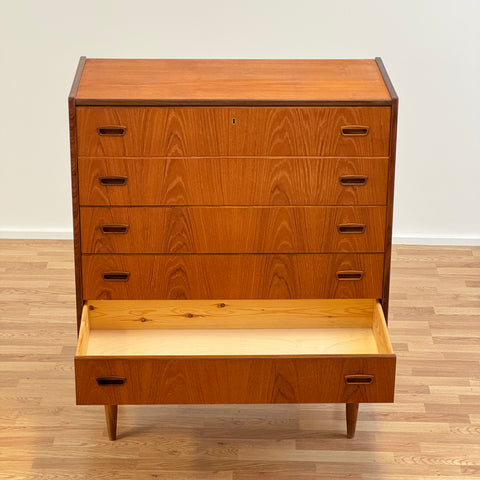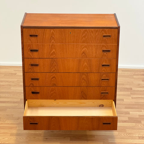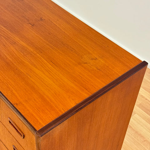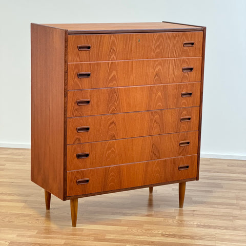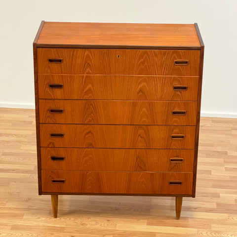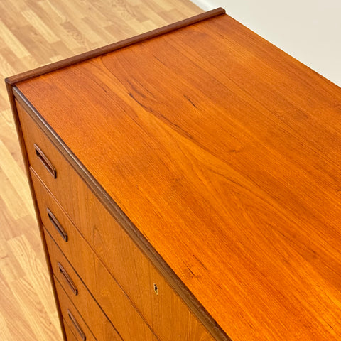 Byrå tillverkad i Danmark på 1950-60-talet. Den är gjord av massivt teakträ i konstruktionen och teakfaner på ovansidan. Den har en ovanlig storlek, bredare än en vanlig byrå. Den har noggrant restaurerats av vårt team och har behandlats med ett lager av linolja och hårdvaxolja. Det är en begagnad vara med användningsspår, såsom små märken och repor. Om du har fler frågor kan du kontakta oss via info@beyovintage.se.