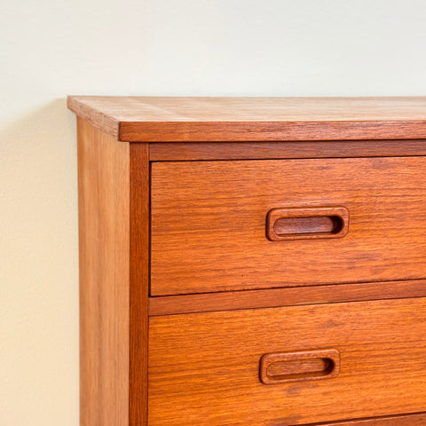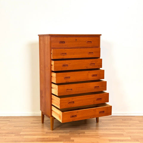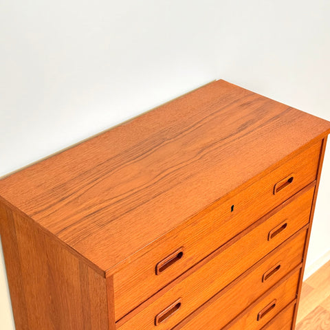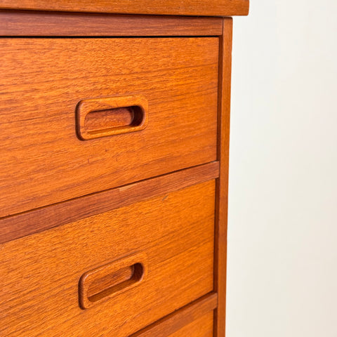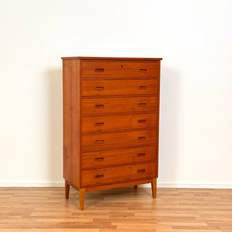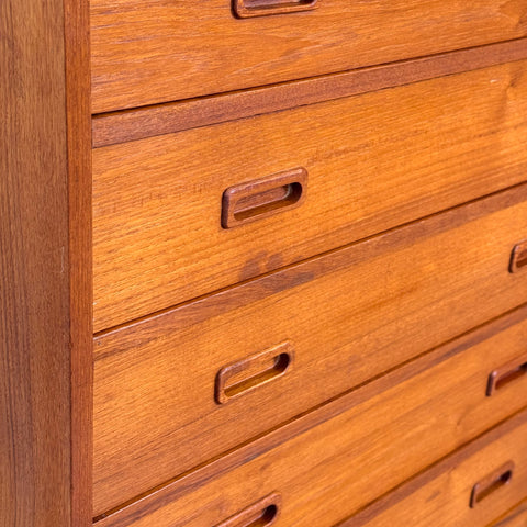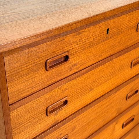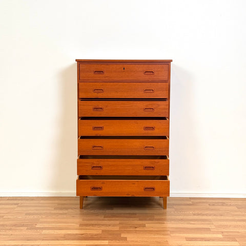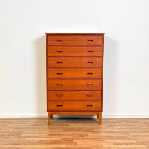 Byrå med 7 lådor tillverkad i Danmark på 1950-60-talet. Den är gjord av teakträ i strukturen och med teakfaner på ovansidan. Den har noggrant restaurerats av vårt team och har behandlats med ett lager av linolja och hårdvaxolja. I restaurerat skick, med märken och repor synliga på ytan och sidorna.