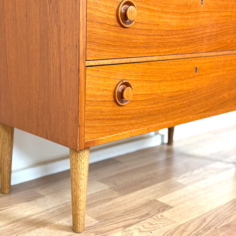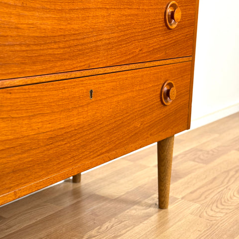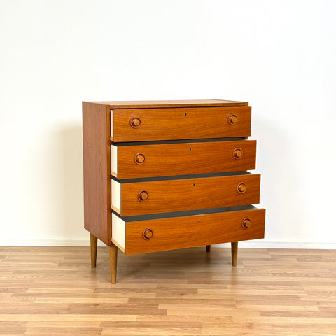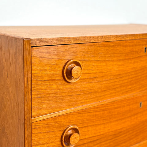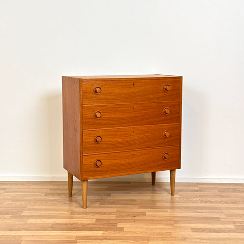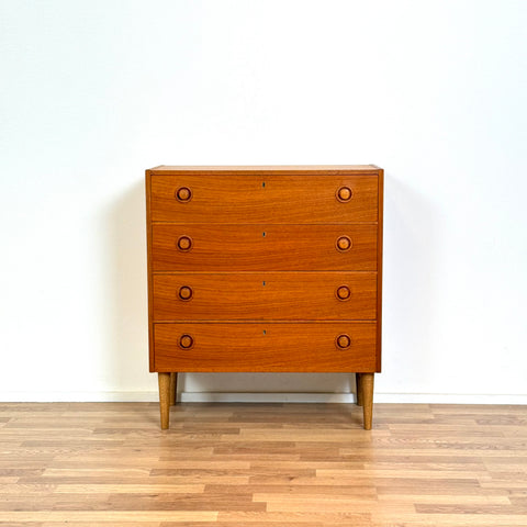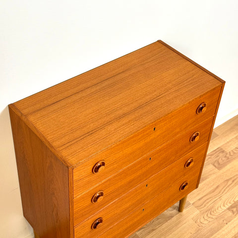 Byrå med 4 lådor tillverkad i Sverige på 1950-60-talet. Den är gjord av teakträ i konstruktionen och med teakfaner på ovansidan. Den har noggrant restaurerats av vårt team och har behandlats med ett lager av linolja och hårdvaxolja. Det är en begagnad vara med användningsspår, såsom små märken och repor.