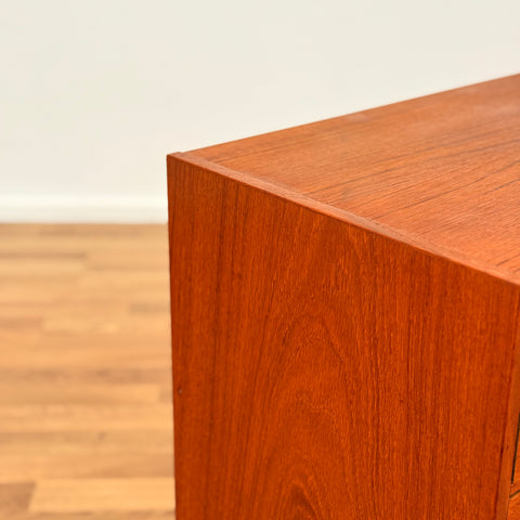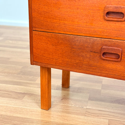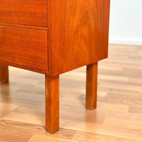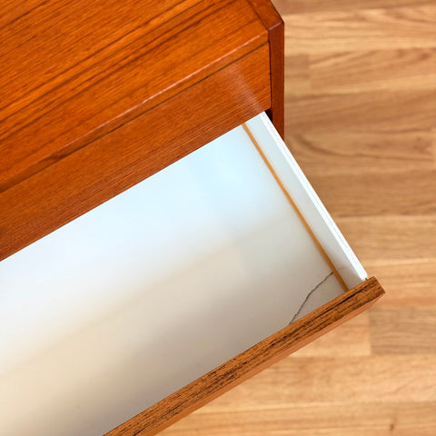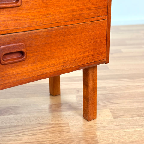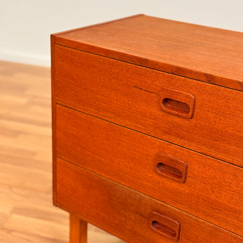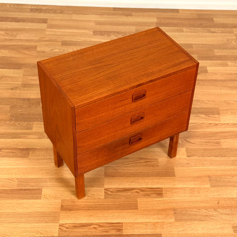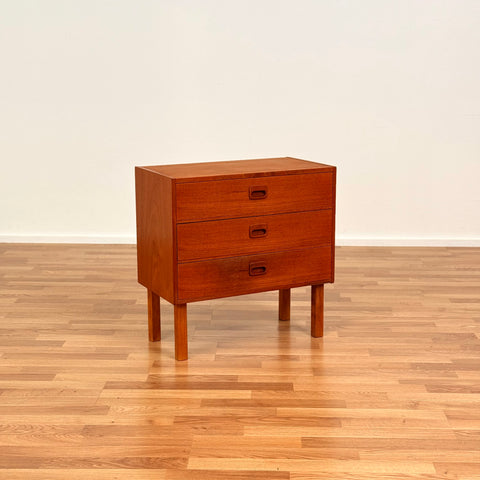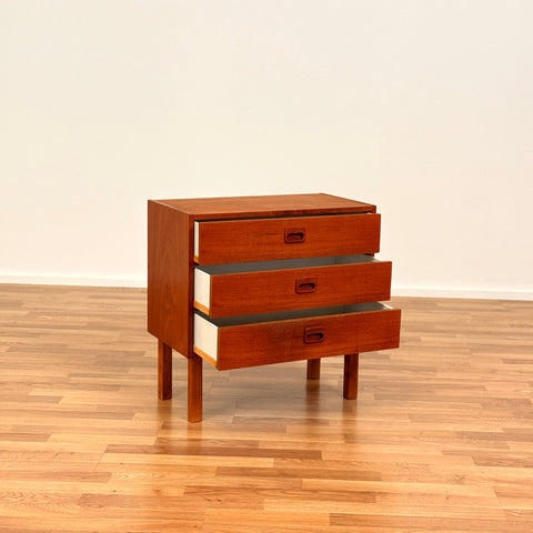 Liten byrå med 3 lådor tillverkad i Sverige på 1960-70-talet. Den är gjord av teakträ i strukturen och av teakfaner på ovansidan. Den har noggrant restaurerats av vårt team och har behandlats med ett lager av grundolja och hårdvaxolja. I restaurerat skick, med märken och repor synliga på ytan och sidorna.