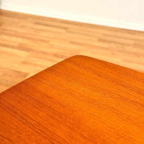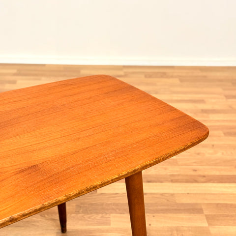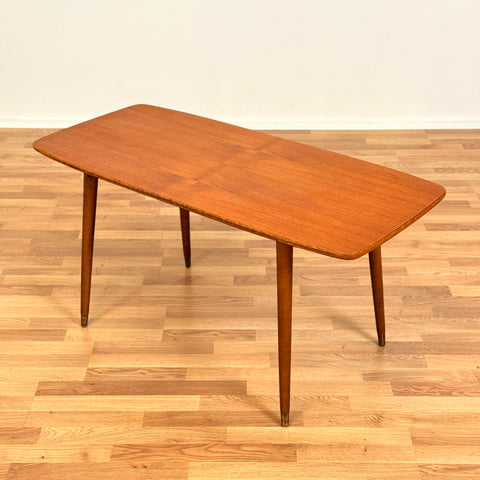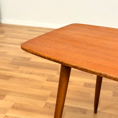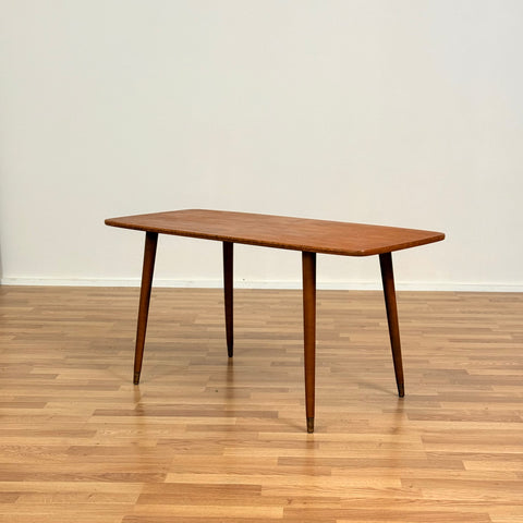Soffbordet tillverkades i Sverige på 1950-60-talet. Det är gjort av teakfaner på ovansidan och massivt bokträ på benen. Bordet har noggrant restaurerats av vårt team och har behandlats med ett lager av linolja och hårdvaxolja. Bordet är en begagnad vara i restaurerat skick med små spår av användning såsom små repor.