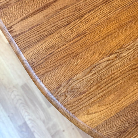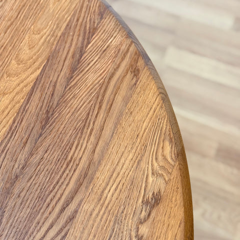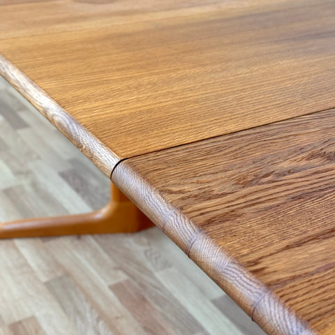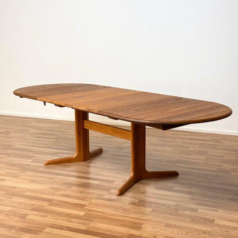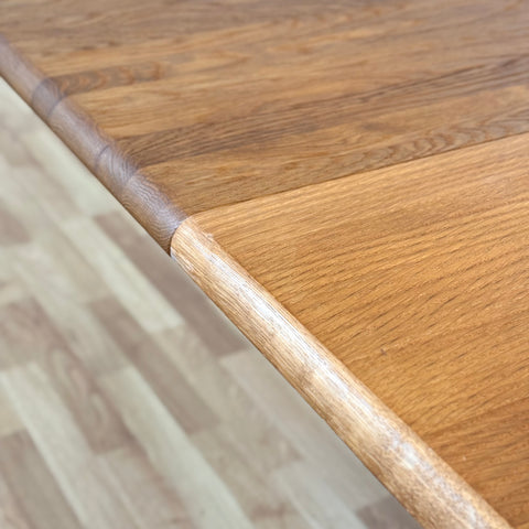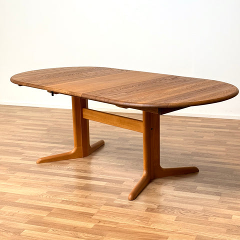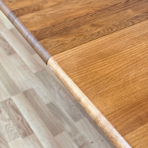 Matbordet tillverkades i Danmark omkring 1980-talet av Skovby Møbelfabrik, Modell 75. Det är gjort av massivt ekträ och på ovansidan. Matbordet har noggrant restaurerats av vårt team och har behandlats med ett lager av linolja och hårdvaxolja. Bordet är en begagnad vara i restaurerat skick med små användningsspår såsom små repor. Bordet har en fläck på förlängningsskivorna men är i övrigt i gott skick.