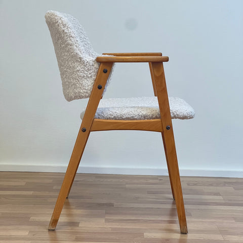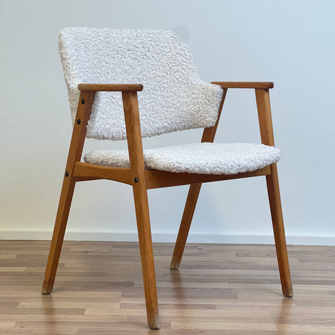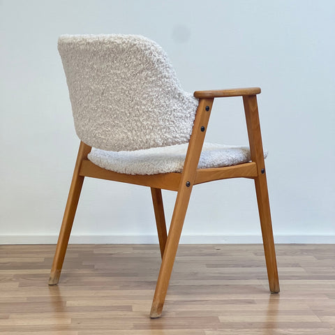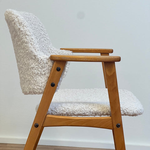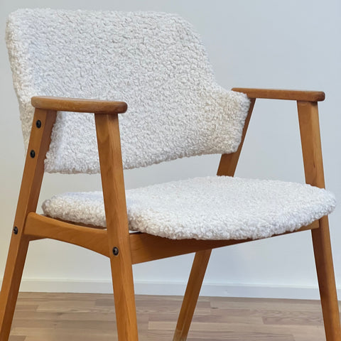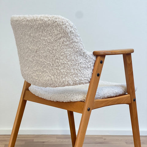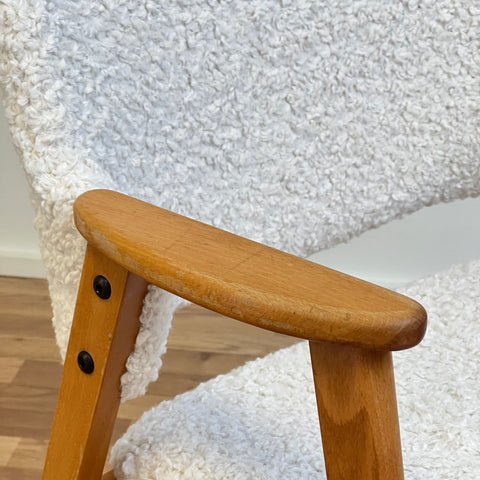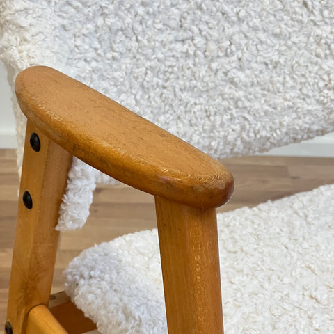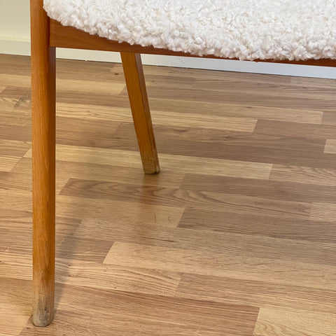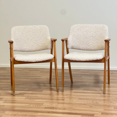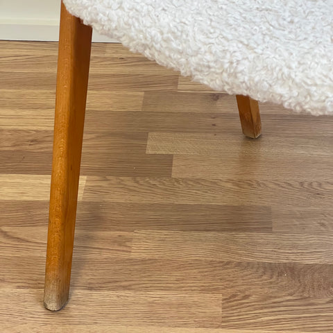 Set om två stolar tillverkade i Sverige på 1950-60-talet. Stolarna är gjorda av bokträ i konstruktionen. Stolarna har restaurerats och klätts om av vårt team, men det finns synliga skador på konstruktionen. Stoppningen har bytts ut och vi har valt ett off-white/ljusbeige teddytyg för dessa delar. De säljs som ett set om två och priset är per styck, för att se tillgänglighet eller köpa endast en, vänligen kontakta oss via info@beyovintage.se.