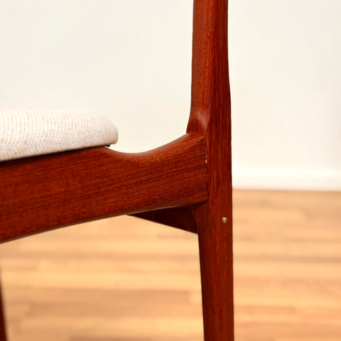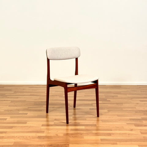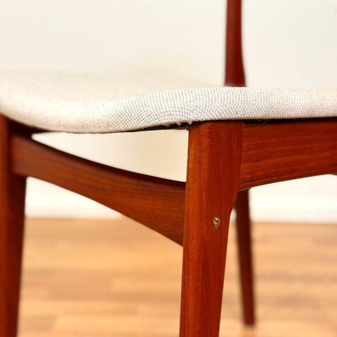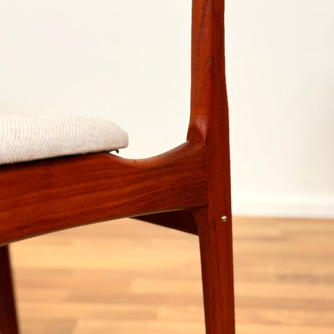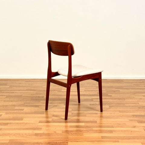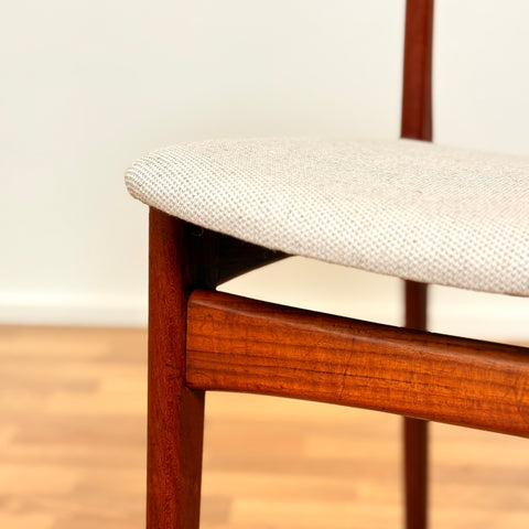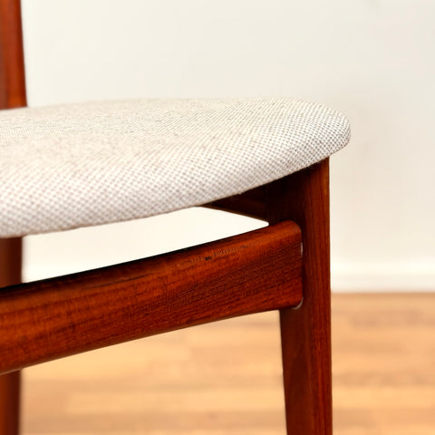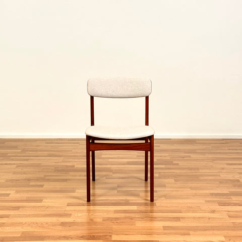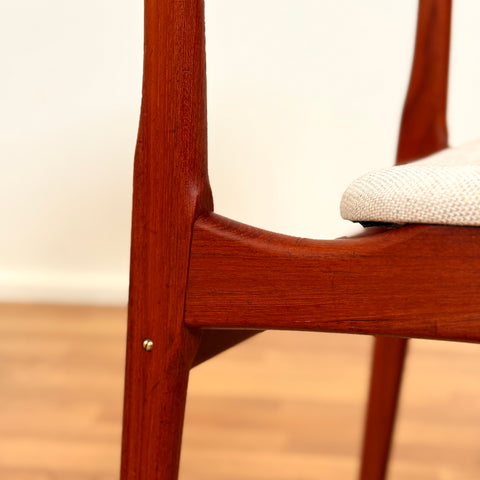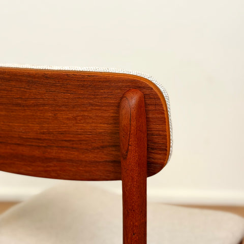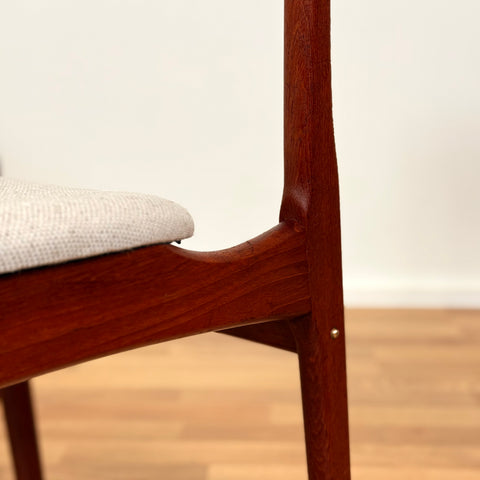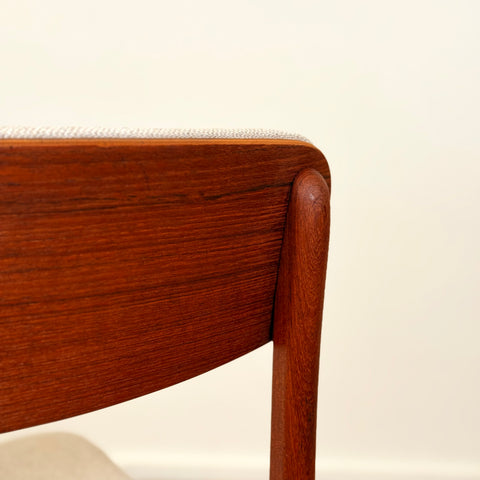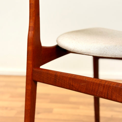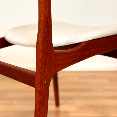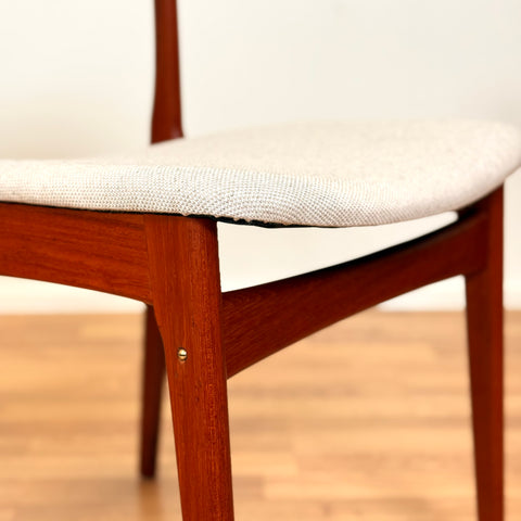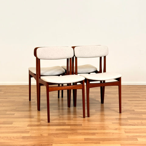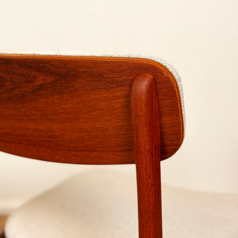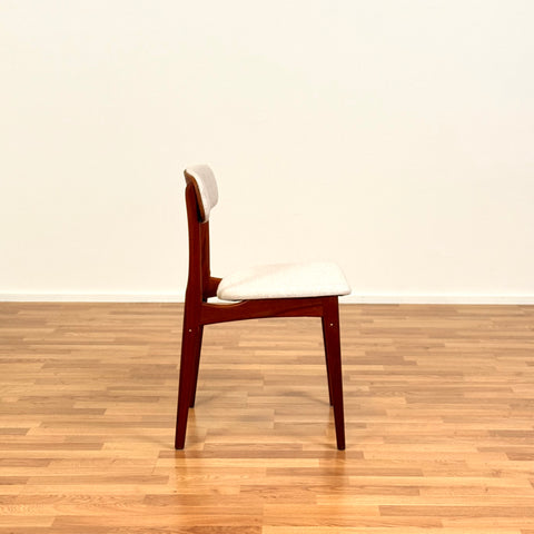 Set om 4 matstolar tillverkade i Danmark på 1950-60-talet av B. Rasmussen för Thorso Mobelfabrik. Stolarna är gjorda av teakträ i strukturen. Stolarna har restaurerats och omklätts av vårt team. Stoppningen har bytts ut, och vi har valt ett off-white tyg till dessa delar. De säljs som ett set om 4 och priset är per set.
