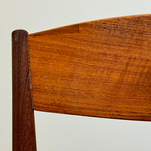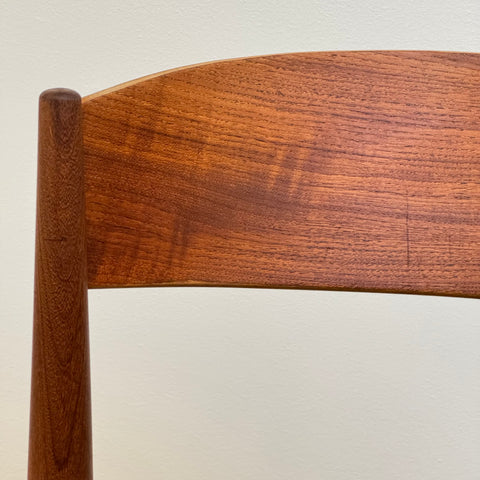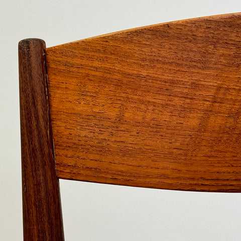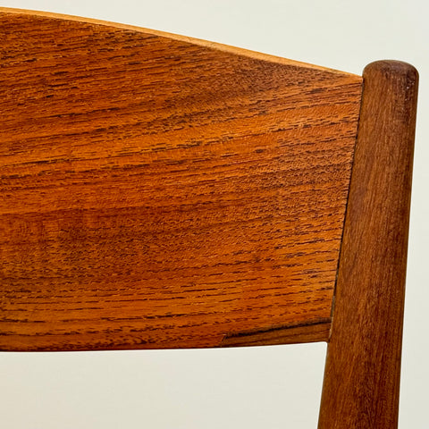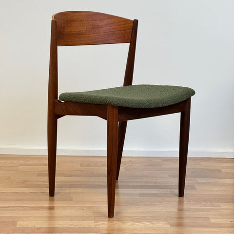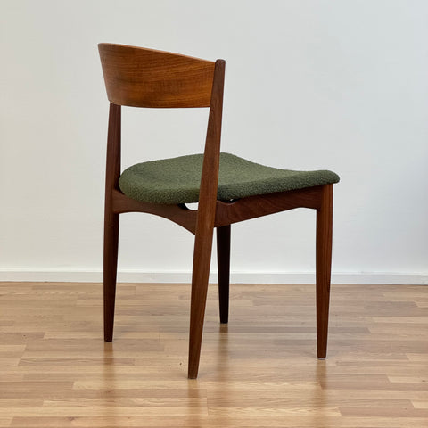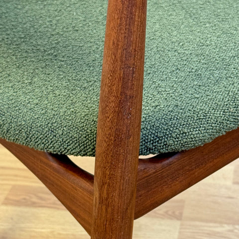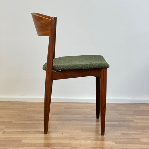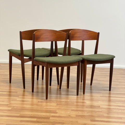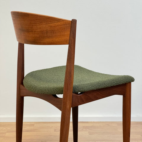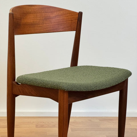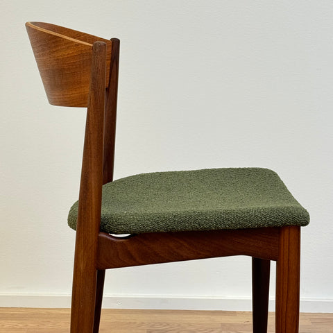 Set om fyra stolar tillverkade i Danmark på 1950-60-talet av Jydsk Mobelindustri. Stolarna är gjorda av massiv teak på stommen och teakfaner på ryggstödet. Stolarna har blivit helt renoverade och omklädda av vårt team. Stoppningen har bytts ut och vi valde ett mörkgrönt tyg för dessa delar. Viss slitage är synligt på stolarna, men de är i vackert vintage skick. De säljs som ett set om 4 och priset är per styck.