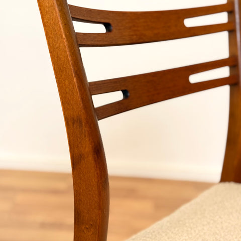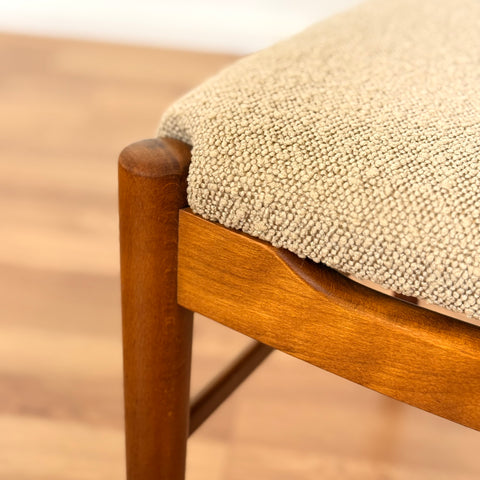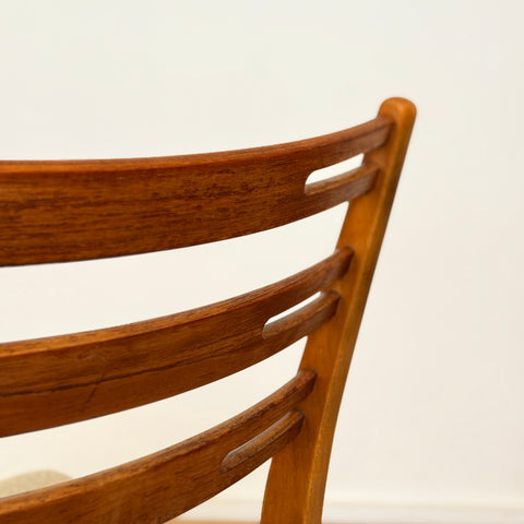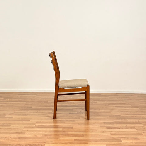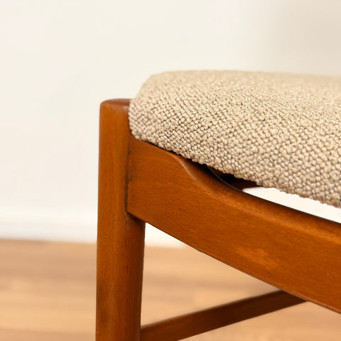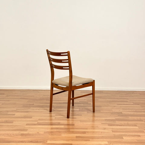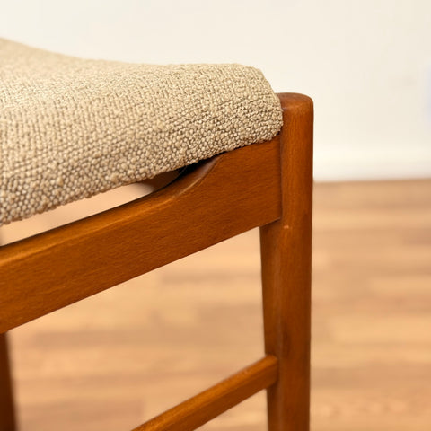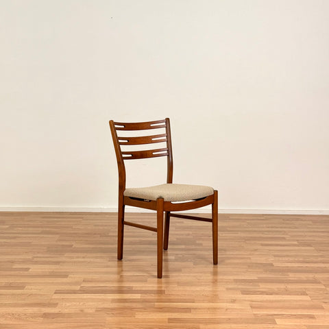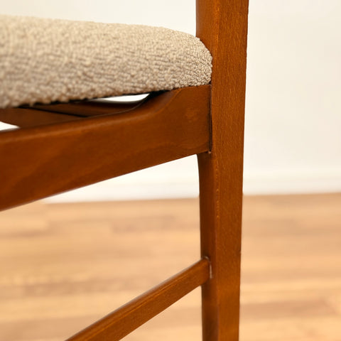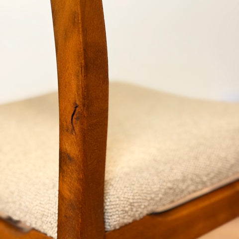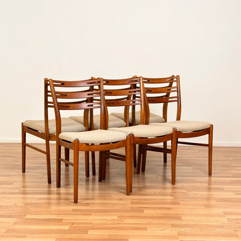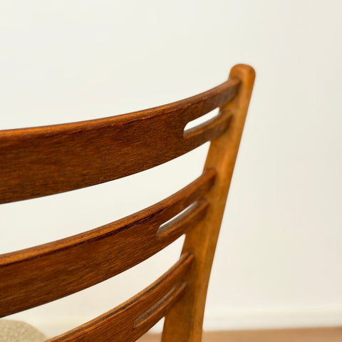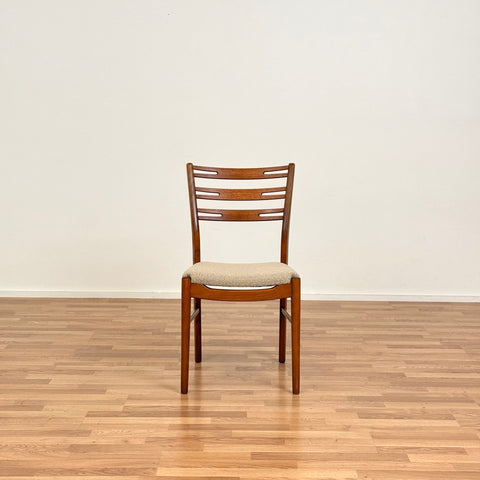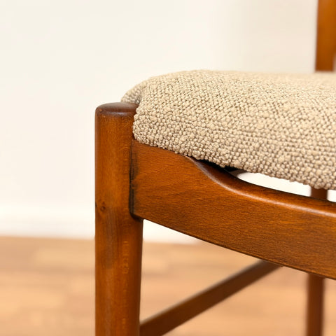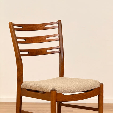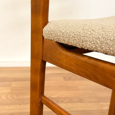 Set om 6 matstolar 'modell 219' tillverkade i Danmark på 1950-60-talet av Farstrup. Stolarna är gjorda av teak på ryggstödet och bokträ på stommen. Stolarna har restaurerats och omklätts av vårt team. Stoppningen har bytts ut, och vi har valt ett beige tyg till dessa exemplar. De säljs som ett set om 6 och priset är per set.