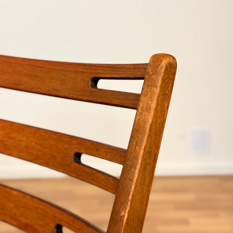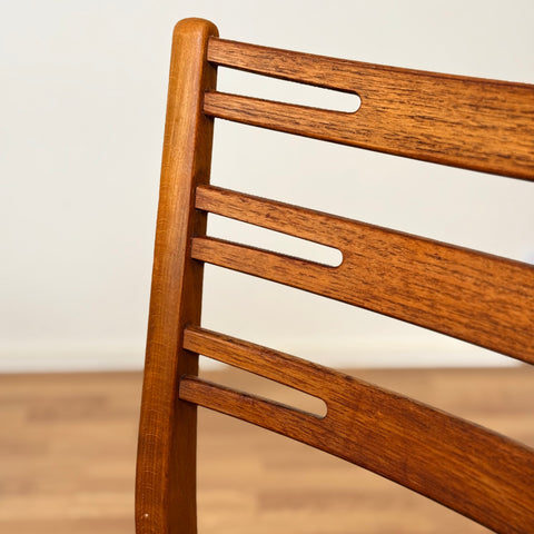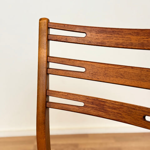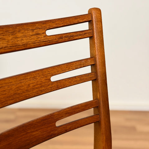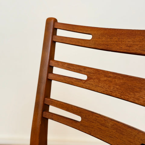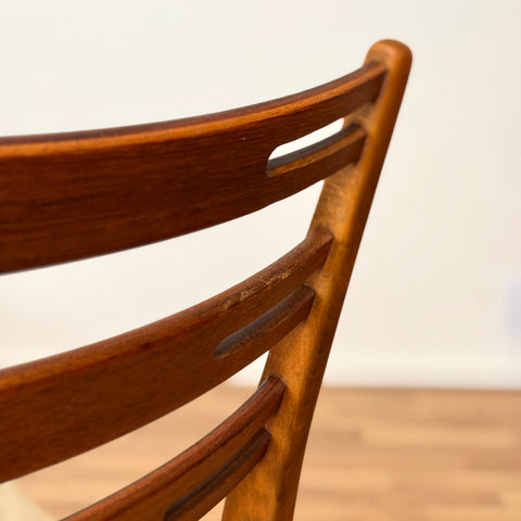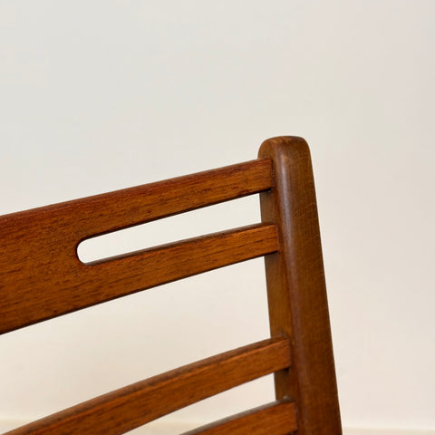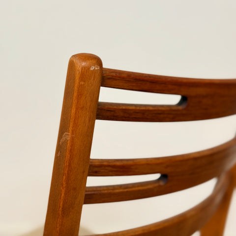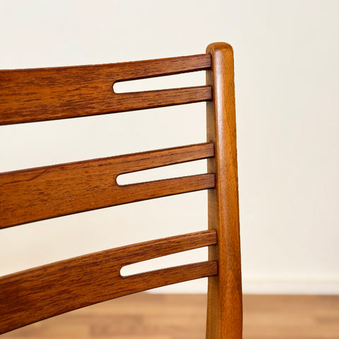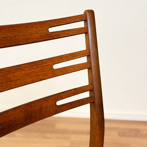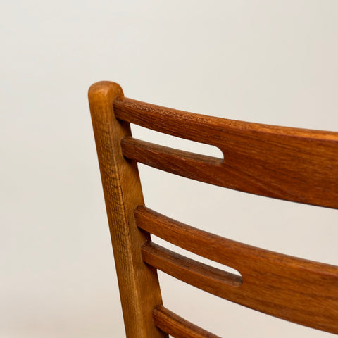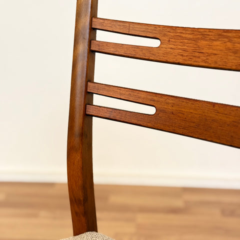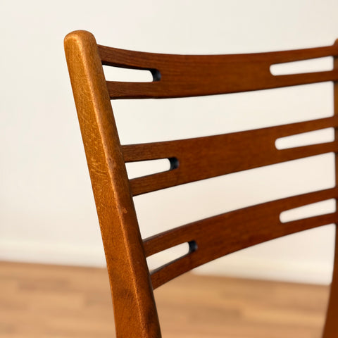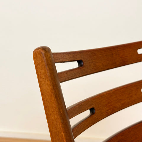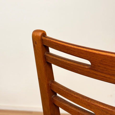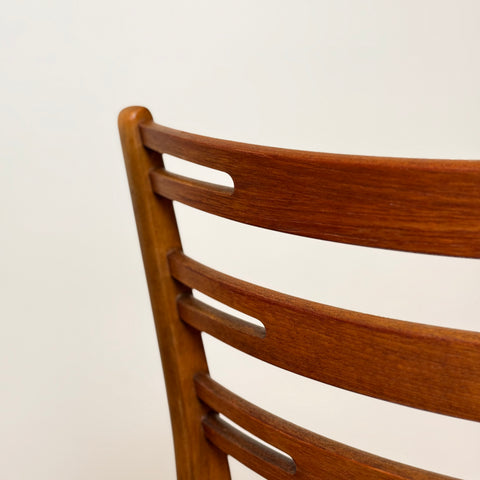 Set om 6 matstolar 'modell 219' tillverkade i Danmark på 1950-60-talet av Farstrup. Stolarna är gjorda av teak på ryggstödet och bokträ på stommen. Stolarna har restaurerats och omklätts av vårt team. Stoppningen har bytts ut, och vi har valt ett beige tyg till dessa exemplar. De säljs som ett set om 6 och priset är per set.