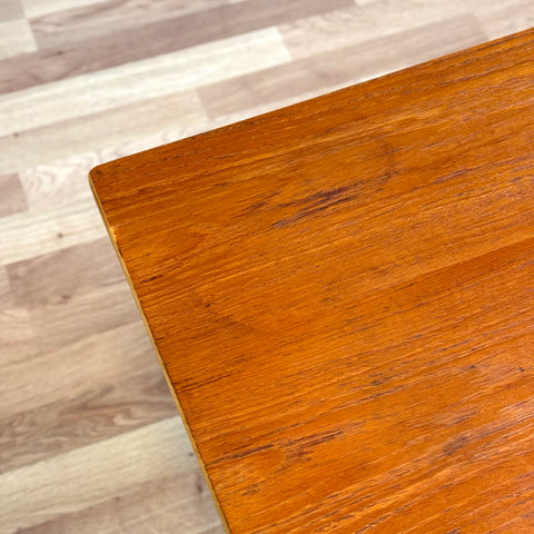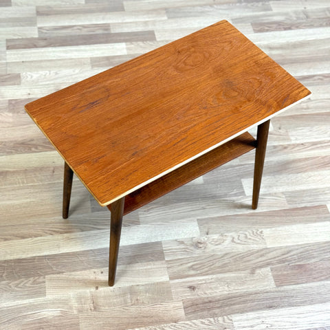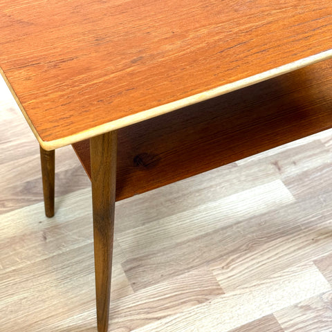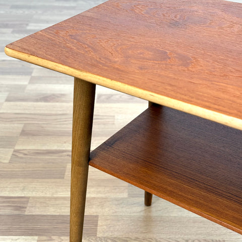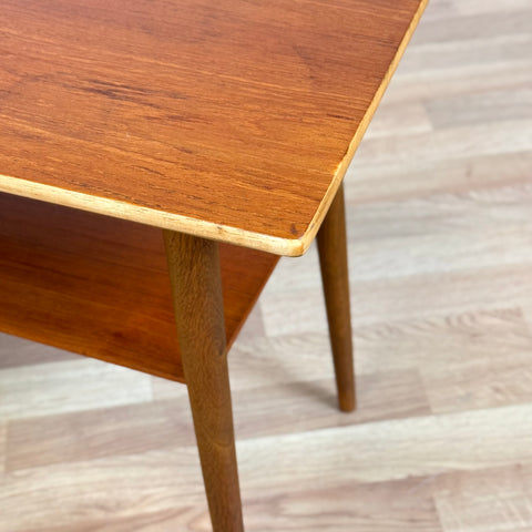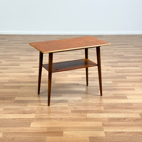 Sidobordet tillverkades i Danmark på 1950- och 60-talen. Det är gjort av teakfaner på ovansidan och valnöt på benen. Bordet har noggrant restaurerats av vårt team och har behandlats med ett lager av linolja och hårdvaxolja. Bordet är ett begagnat föremål i restaurerat skick med små användningsspår såsom små repor samt ett märke på ovansidan.