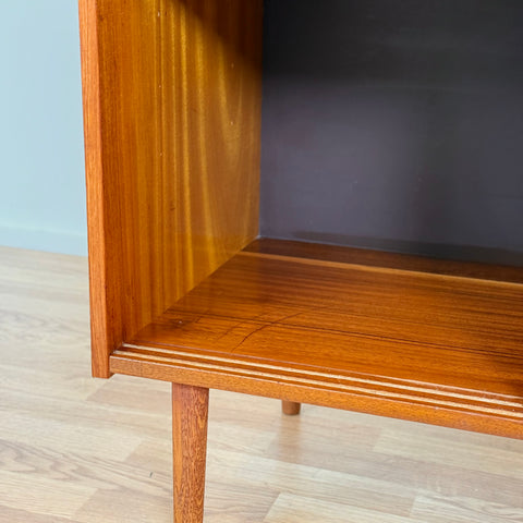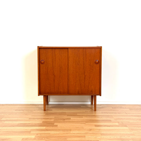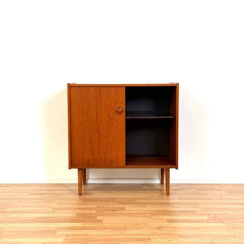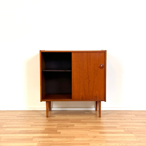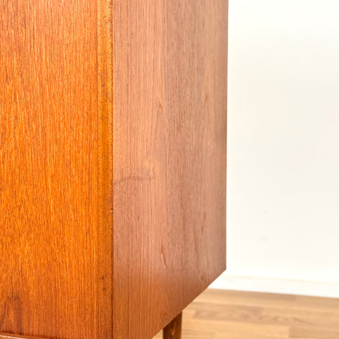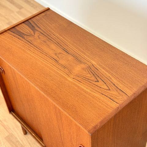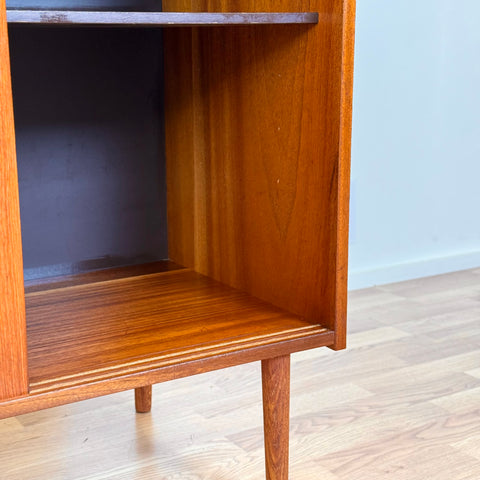 Skåp tillverkat i Danmark på 1950-60-talet av Jr. Credenza. Det är gjort av teakträ i konstruktionen och teak på ovansidan. Skåpet har noggrant restaurerats av vårt team och har behandlats med ett lager av linolja och hårdvaxolja. Det är en begagnad vara med användningsspår, såsom små märken och repor. I restaurerat skick med små användningsspår som små repor.