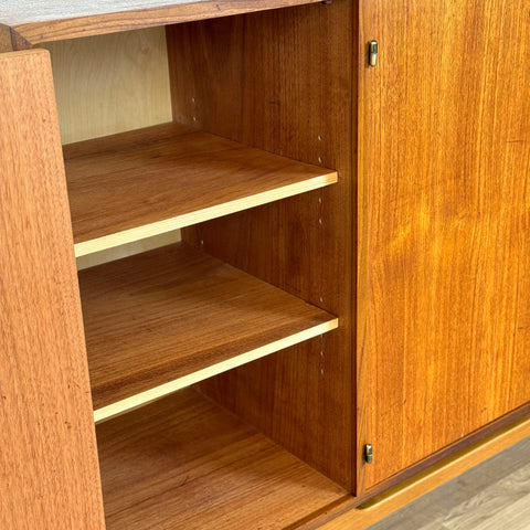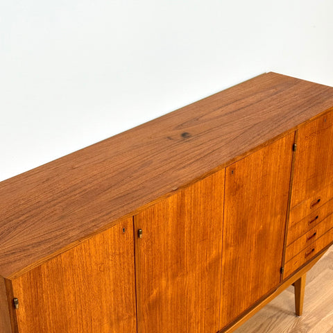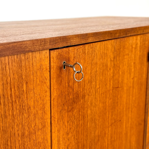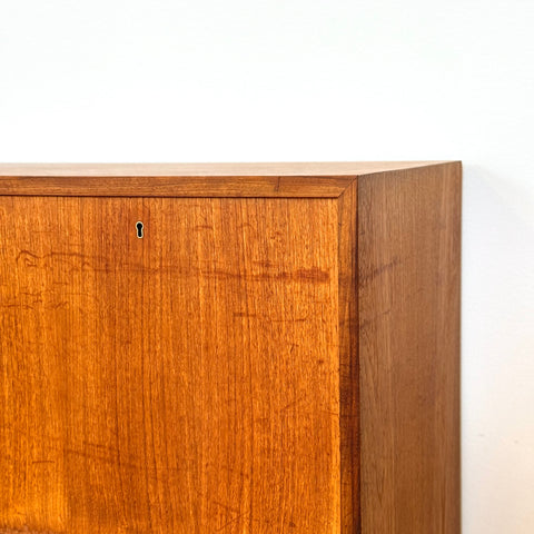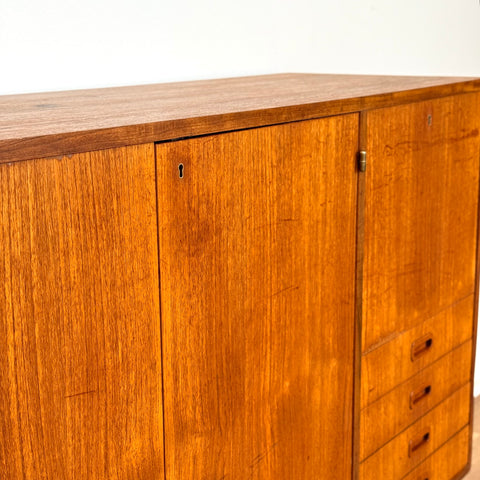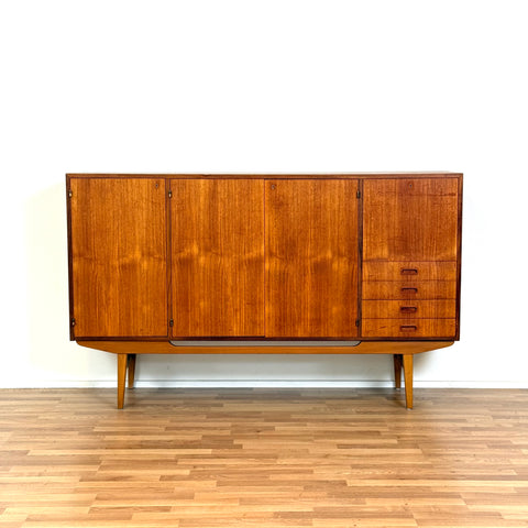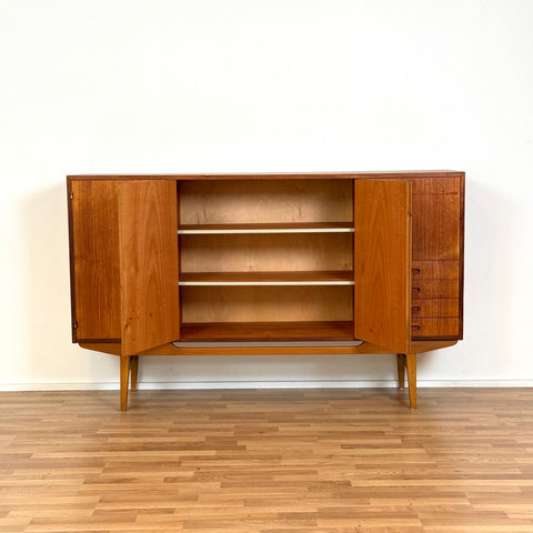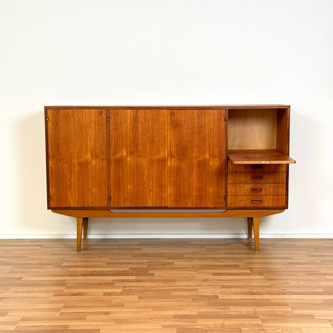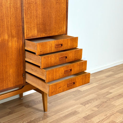 Högskåpet tillverkat i Sverige på 1950-60-talet. Det är gjort av teak och bokfaner. Högskåpet har noggrant restaurerats av vårt team och har behandlats med ett lager av linolja och hårdvaxolja. Det är en begagnad vara i restaurerat skick med märken och repor synliga på ytan och sidorna.