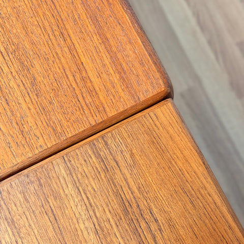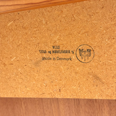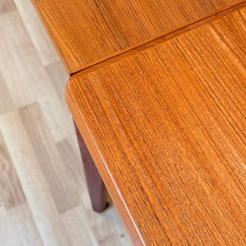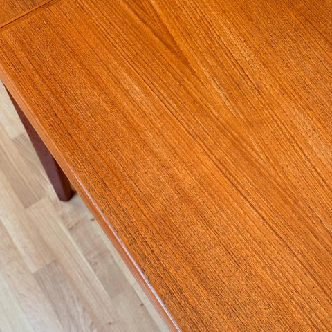 Matbordet tillverkades i Danmark på 1950-60-talet av Vejle Möbelfabrik A/S, designat av Henning Kjærnulf. Det är gjort av teakfaner på ovansidan och i massivt teakträ i konstruktionen. Matbordet har noggrant restaurerats av vårt team och har behandlats med ett lager av linolja och hårdvaxolja. Bordet är en begagnad vara i restaurerat skick med små spår av användning såsom små repor.