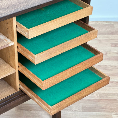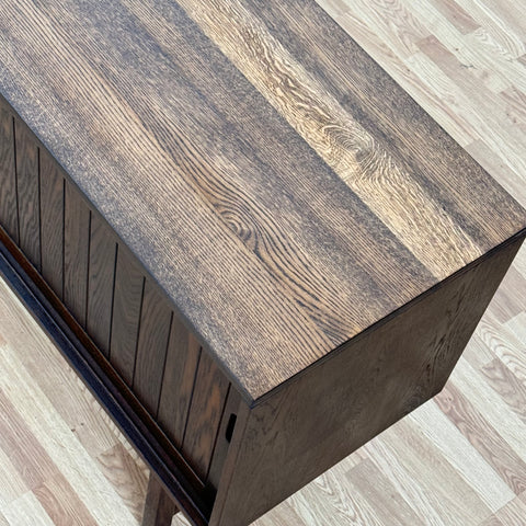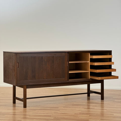 Design av Kurt Ostervig för KP Jorgensen omkring 1960. Betsad ekstruktur. Skänken har noggrant restaurerats av vårt team och har behandlats med ett lager av grundolja och hårdvaxolja. Det är en begagnad vara med spår av användning, såsom små märken och repor. Om du har fler frågor kan du kontakta oss via info@beyovintage.se.