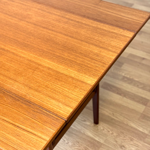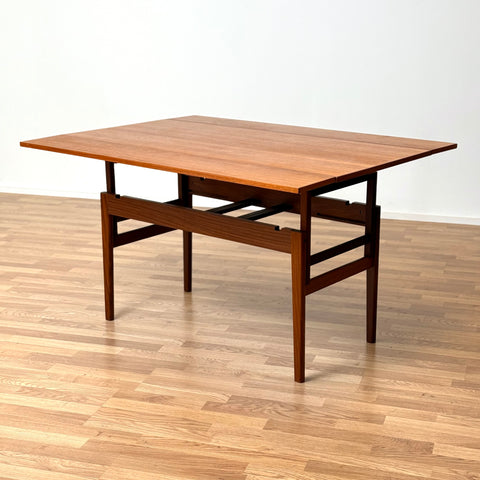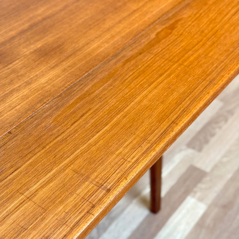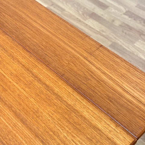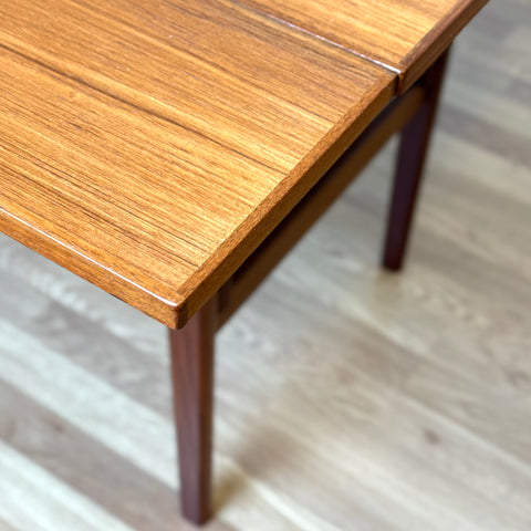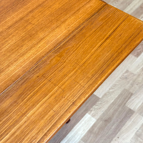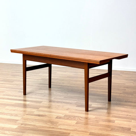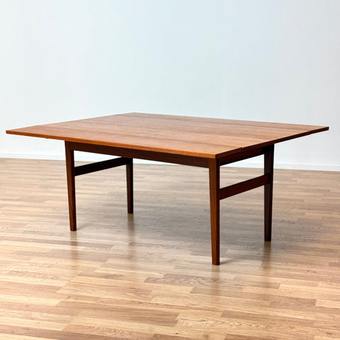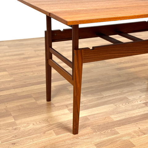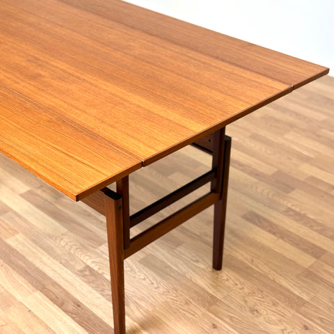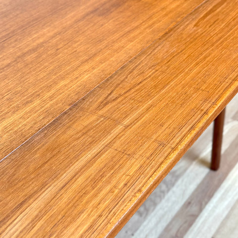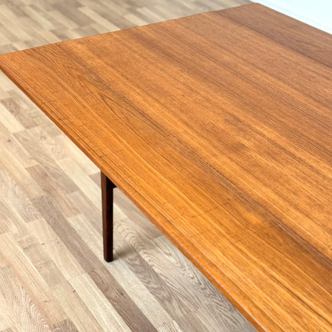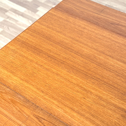 The coffee/dining table with two extensions was manufactured in Denmark in the 1950s-60s. It is made of teak wood on the structured and teak veneered on the top surface. The table has been carefully restored by our team and has been treated with a layer of ground oil and hard wax oil. The table in restored condition with clear damages on the surface and sides.