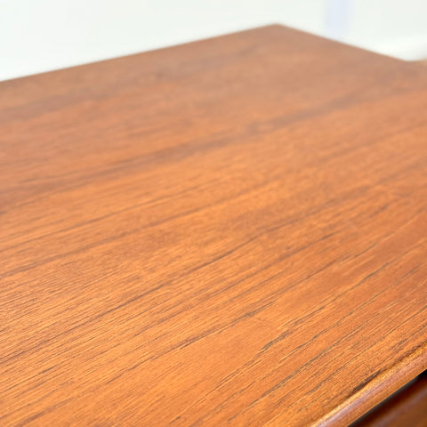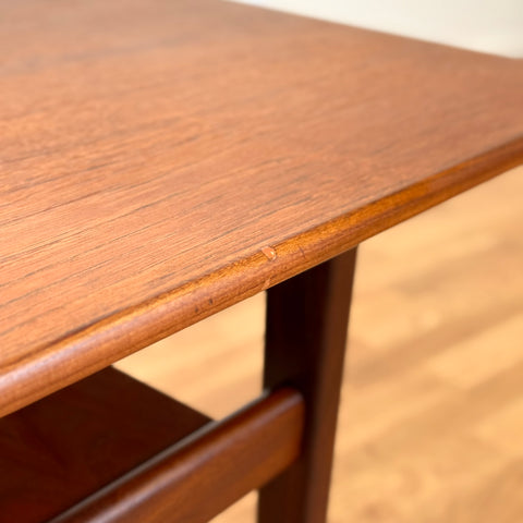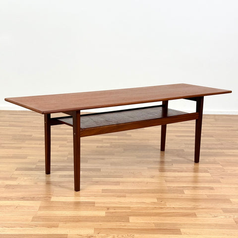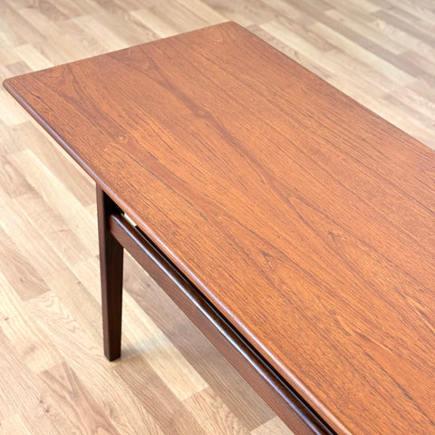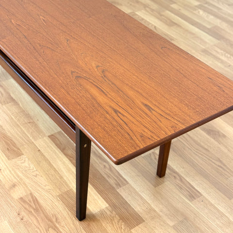 Coffee table manufactured in Denmark in the 1950s-60s. It is made of teak wood on the structure and teak veneer on the top surface. The table has been carefully restored by our team and has been treated with a layer of ground oil and hard wax oil. The table is a used item with traces of use, such as small marks and scratches.