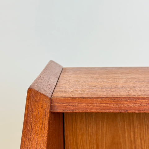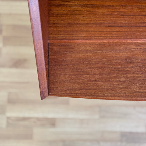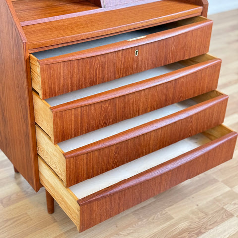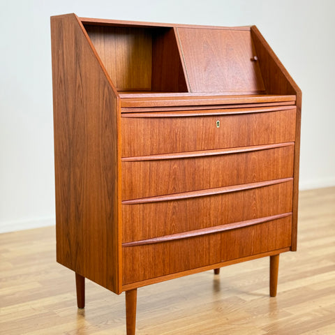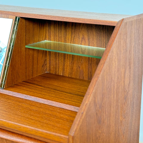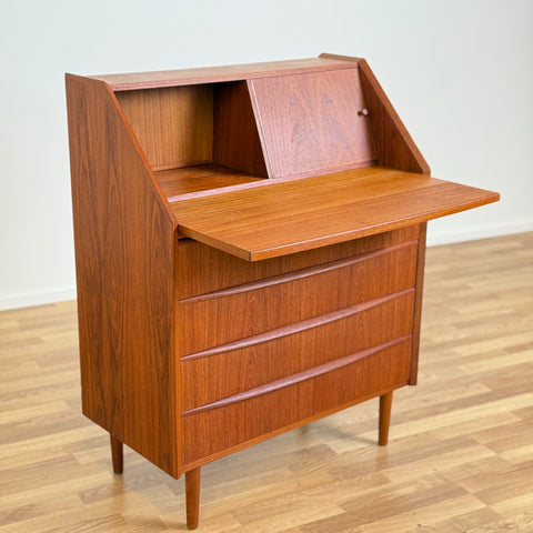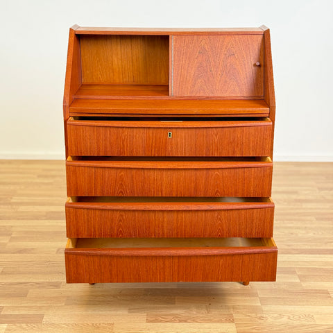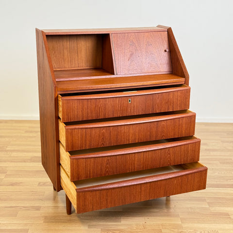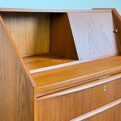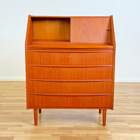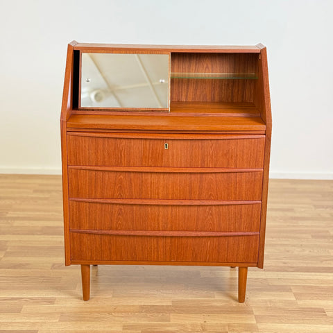 Secretaire manufactured in Denamark in the 1950s-60s. It is made of teak wood and veneer. The cabinet features hidden desk, mirror, and drawers. It has been carefully restored by our team and has been treated with a layer of ground oil and hard wax oil. It is a used item with traces of use, such as small marks and scratches.