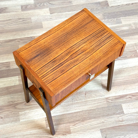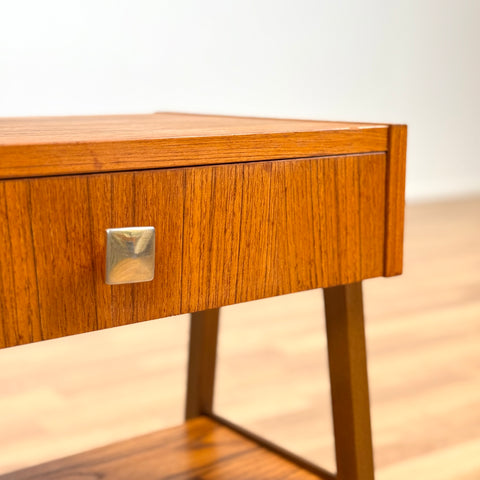 The nightstand was manufactured in Denmark in the 1950s-60s. It is made of teak on the structured and teak veneered on the top surface. The dining table has been carefully restored by our team and has been treated with a layer of ground oil and hard wax oil. The table is a used item in restored condition with small traces of use such as small scratches.