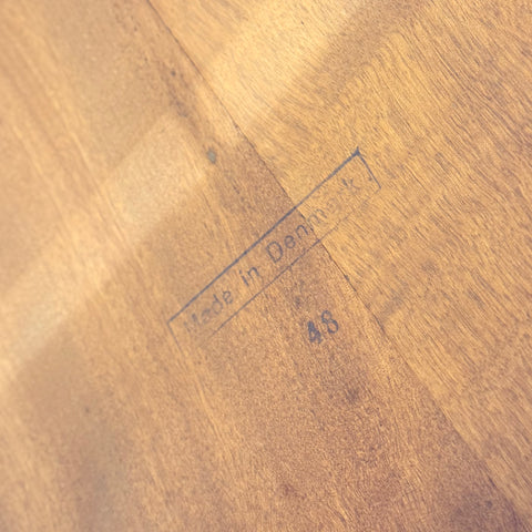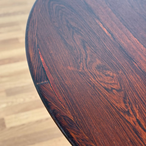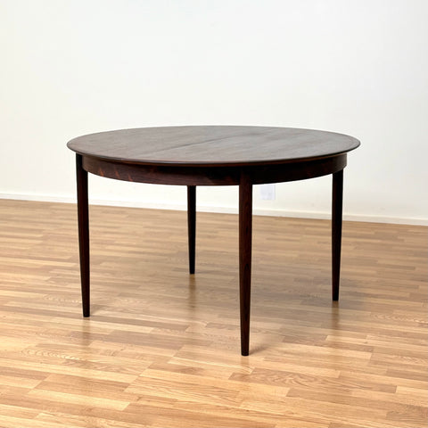 Dining table was manufactured in Denmark in the 1950s-60s. It is made of santos rosewood veneer on the top surface and on the structure. The dining table has been carefully restored by our team and has been treated with a layer of ground oil and hard wax oil. The table is a used item in restored condition with small traces of use such as small scratches and a small veneer damage.
