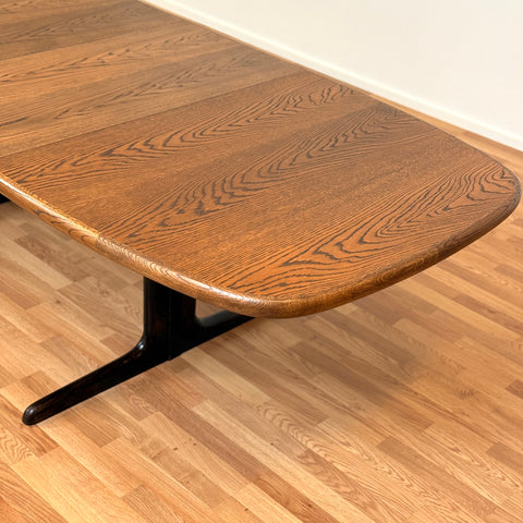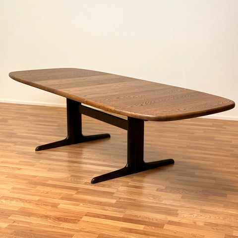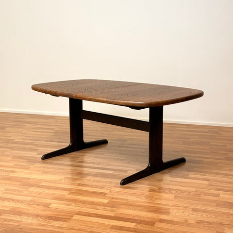 The dining table was manufactured in Denmark in ca. 1980s, by Skovby Møbelfabrik. It is made of solid oak wood on the structure and veneered on top surface. The dining table has been carefully restored by our team and has been treated with a layer of ground oil and hard wax oil. The table is a used item in restored condition with small traces of use such as small scratches.