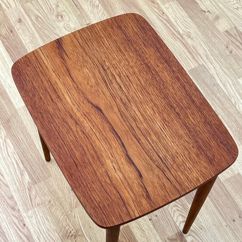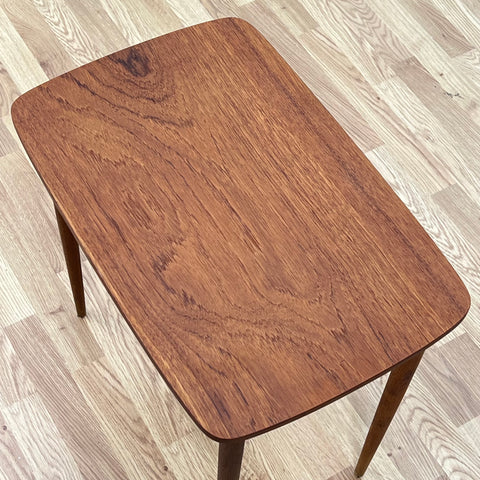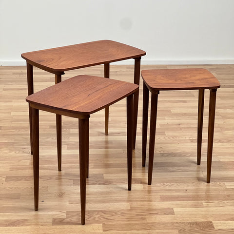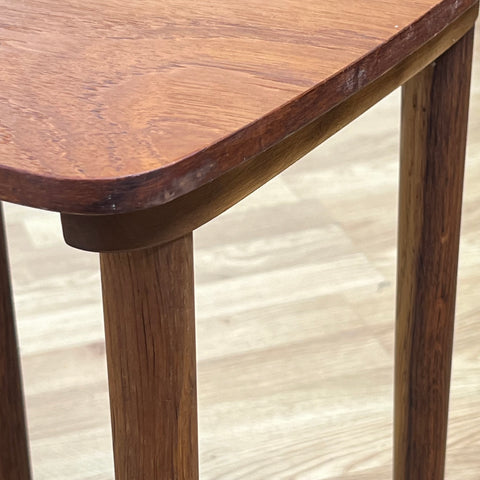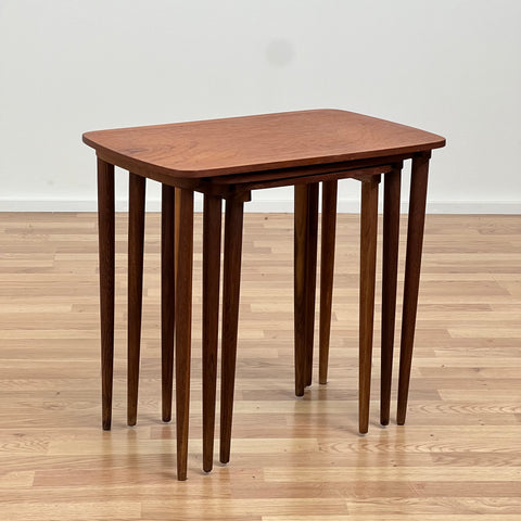Ensemble de trois tables gigognes fabriquées au Danemark dans les années 1960. Elles sont en bois de teck massif et plaqué avec un grain de bois vif dans une teinte chaude. Si vous avez d'autres questions, vous pouvez nous contacter via info@beyovintage.se.