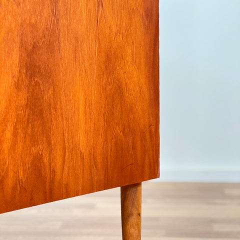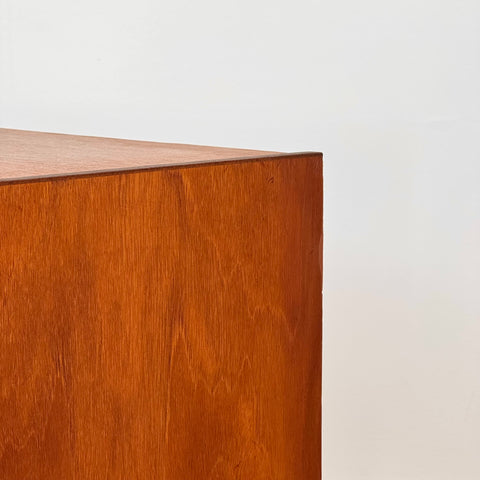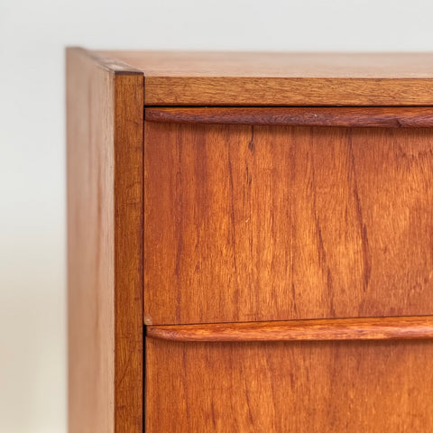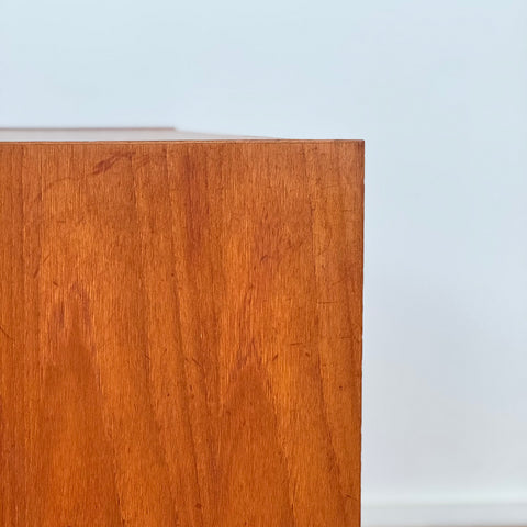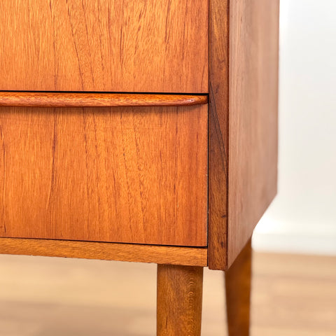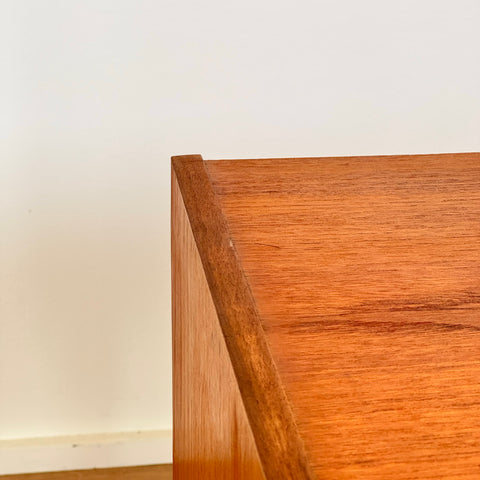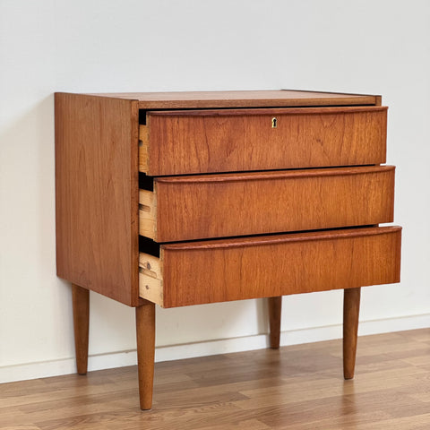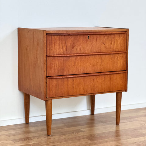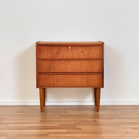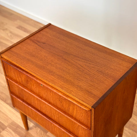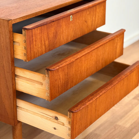 Byrå med 3 lådor tillverkad i Danmark på 1950-60-talet. Den är gjord av teakträ i strukturen och teakfaner på ovansidan. Byrån har noggrant restaurerats av vårt team och har behandlats med ett lager av linolja och hårdvaxolja. I restaurerat skick, med märken och repor synliga på ytan och sidorna